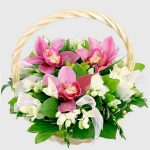 Орхидея цимбидиум бутон – 3 шт.Фрезия – 10 шт.Зелень – 10 шт.Декор флористический – 7 шт.Корзина – 1 шт.Пиафлор (оазис) – 2 шт.