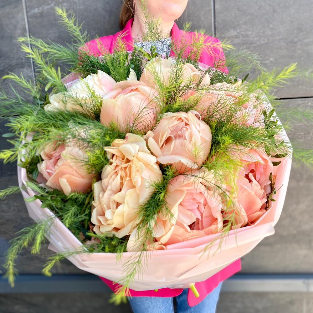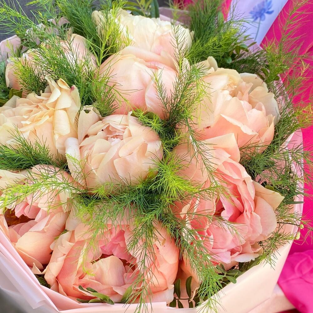 Лента атласная – 1 шт.Упаковка дизайнерская – 2 шт.зелень декоративная пучок – 1 шт.пионы крем ( италия) – 9 шт.