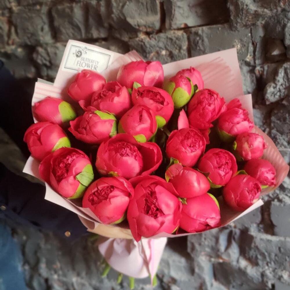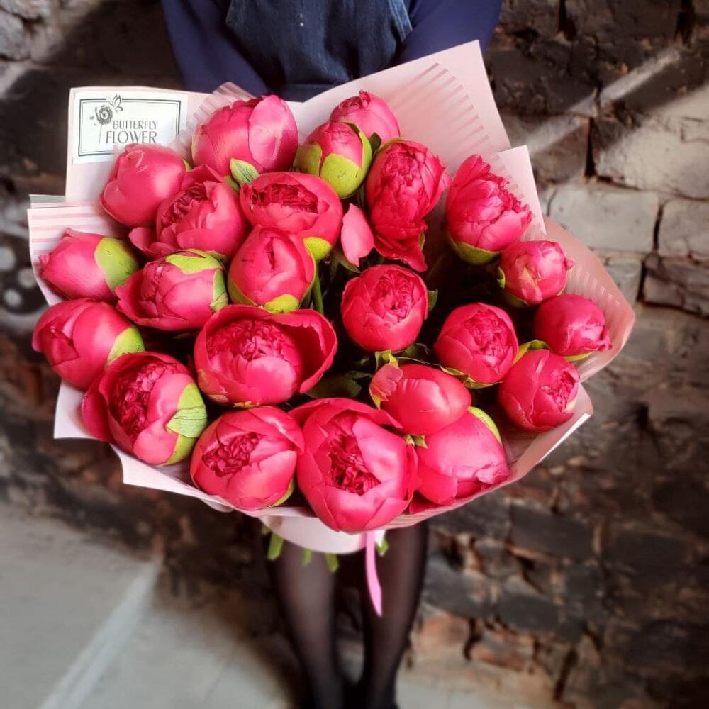 Букет из 23 ярко-розовых пионов в дизайнерской упаковке “Сьюзи Кью”