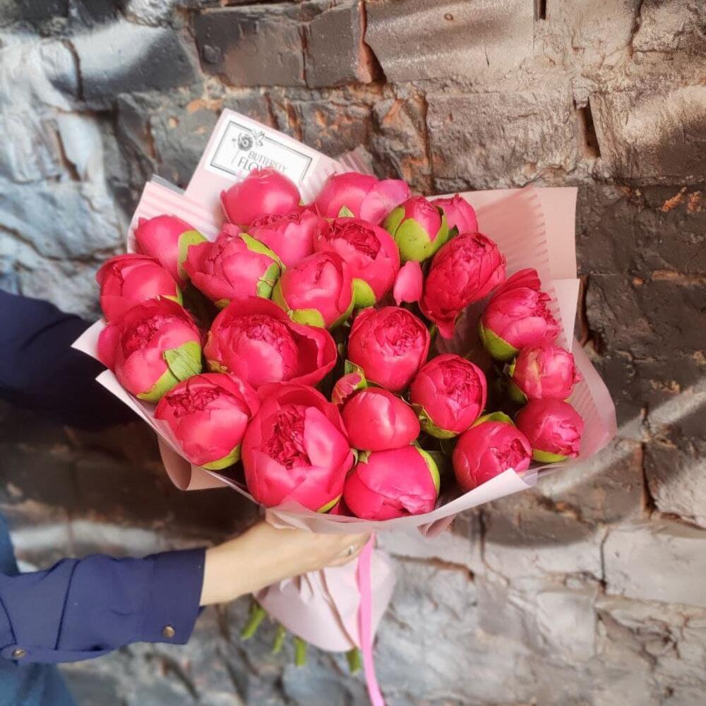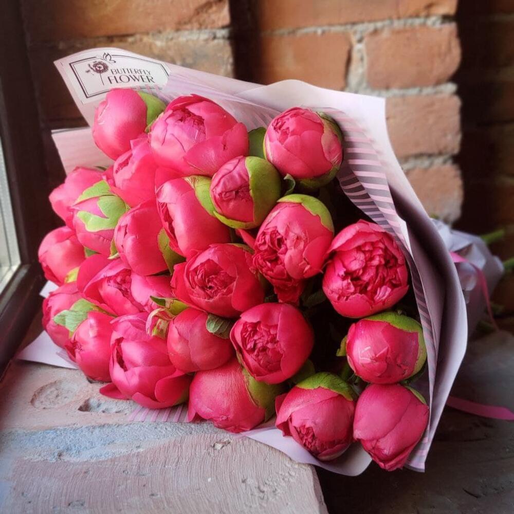 Букет из 23 ярко-розовых пионов в дизайнерской упаковке "Сьюзи Кью"