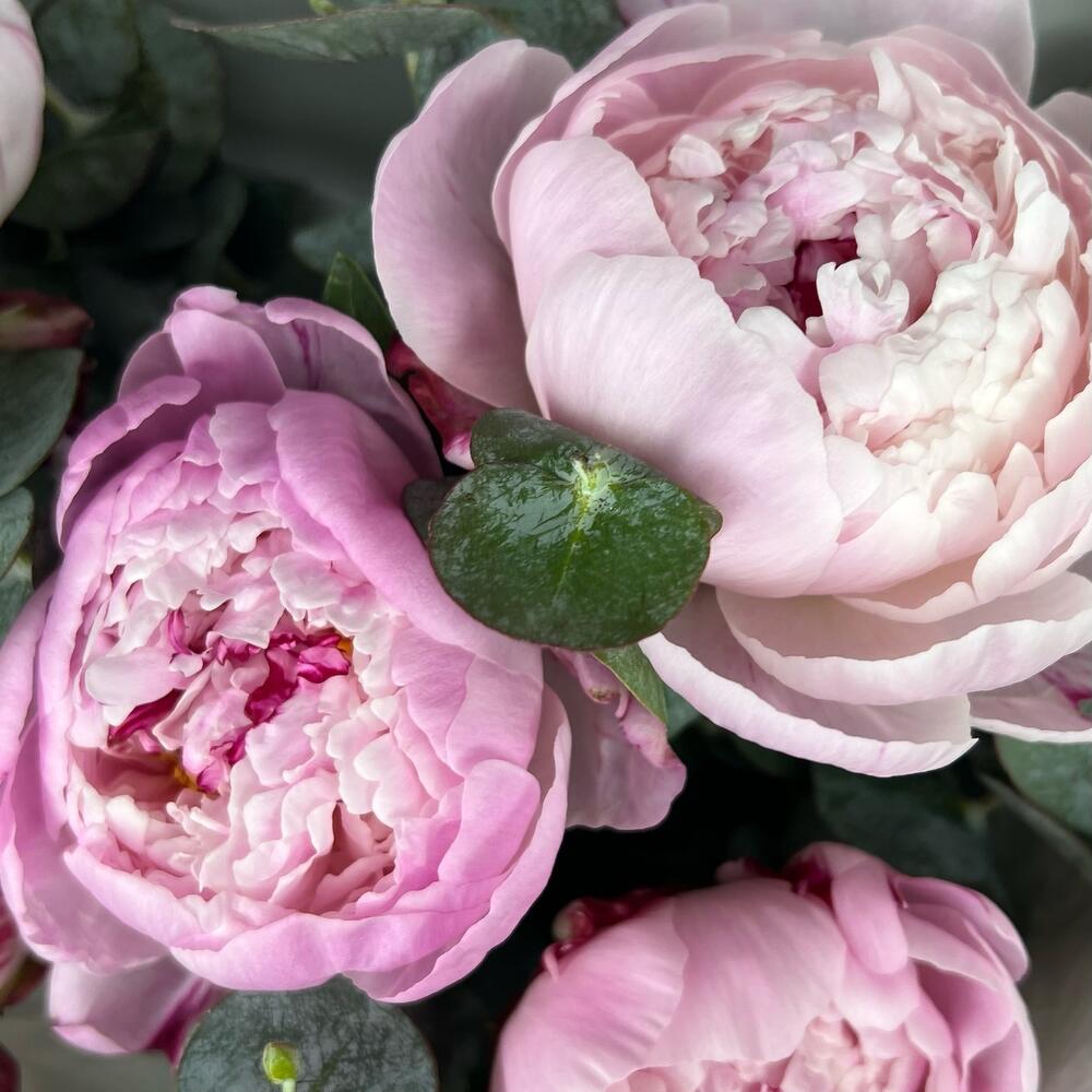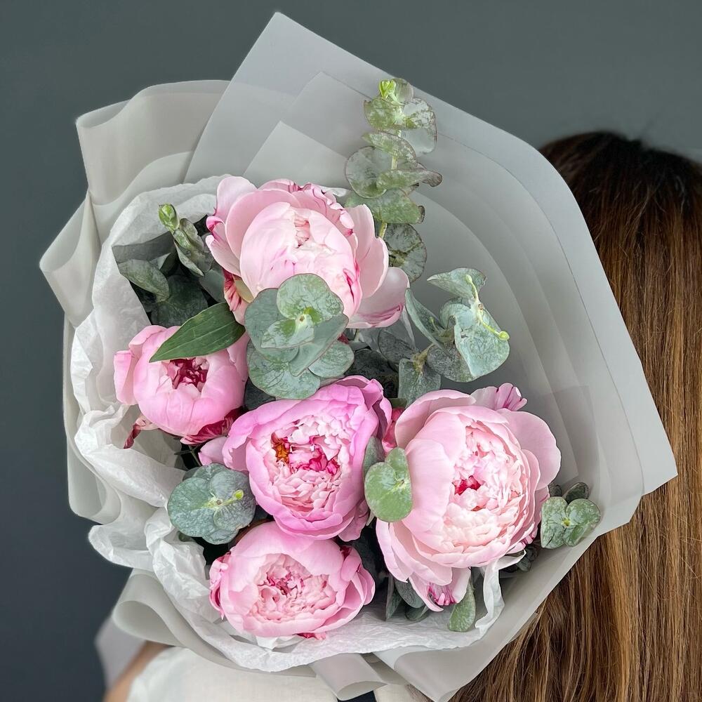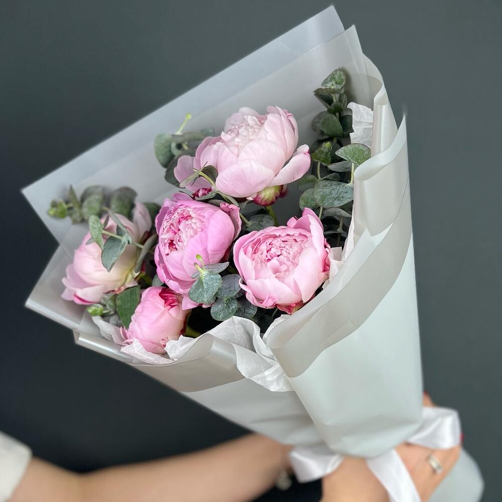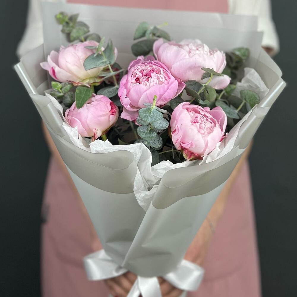 Эвкалипт – 5 шт.Лента атласная – 1 шт.Пион Сара Бернар – 5 шт.Бумага тишью – 1 шт.бумага дизайнерская – 5 шт.