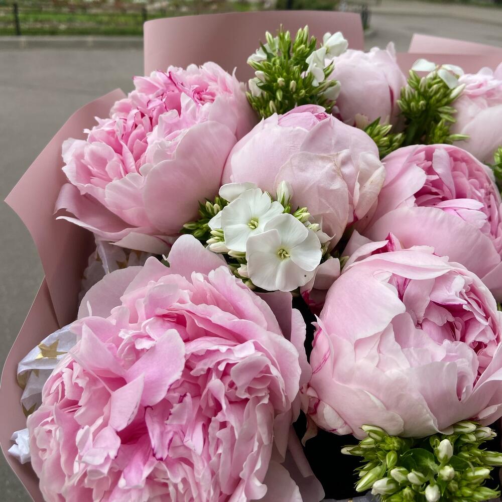 Пион Сара Бернар – 9 шт.Упаковка дизайнерская – 5 шт.Флокс белый – 6 шт.