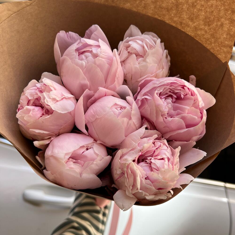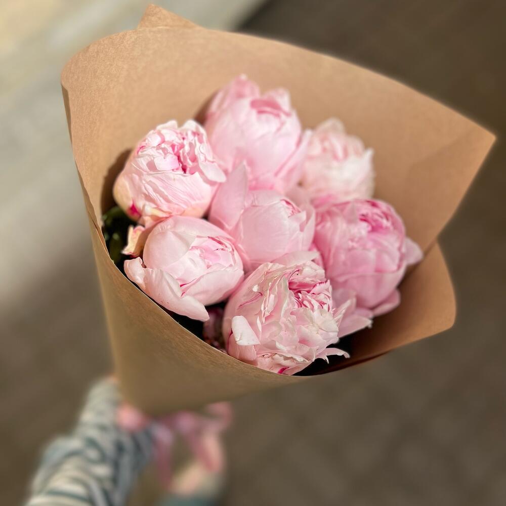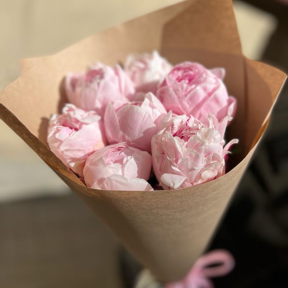 Лента атласная – 1 шт.Крафт упаковка – 2 шт.пион розовый рене – 7 шт.