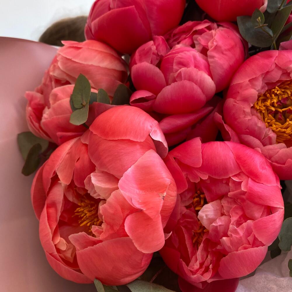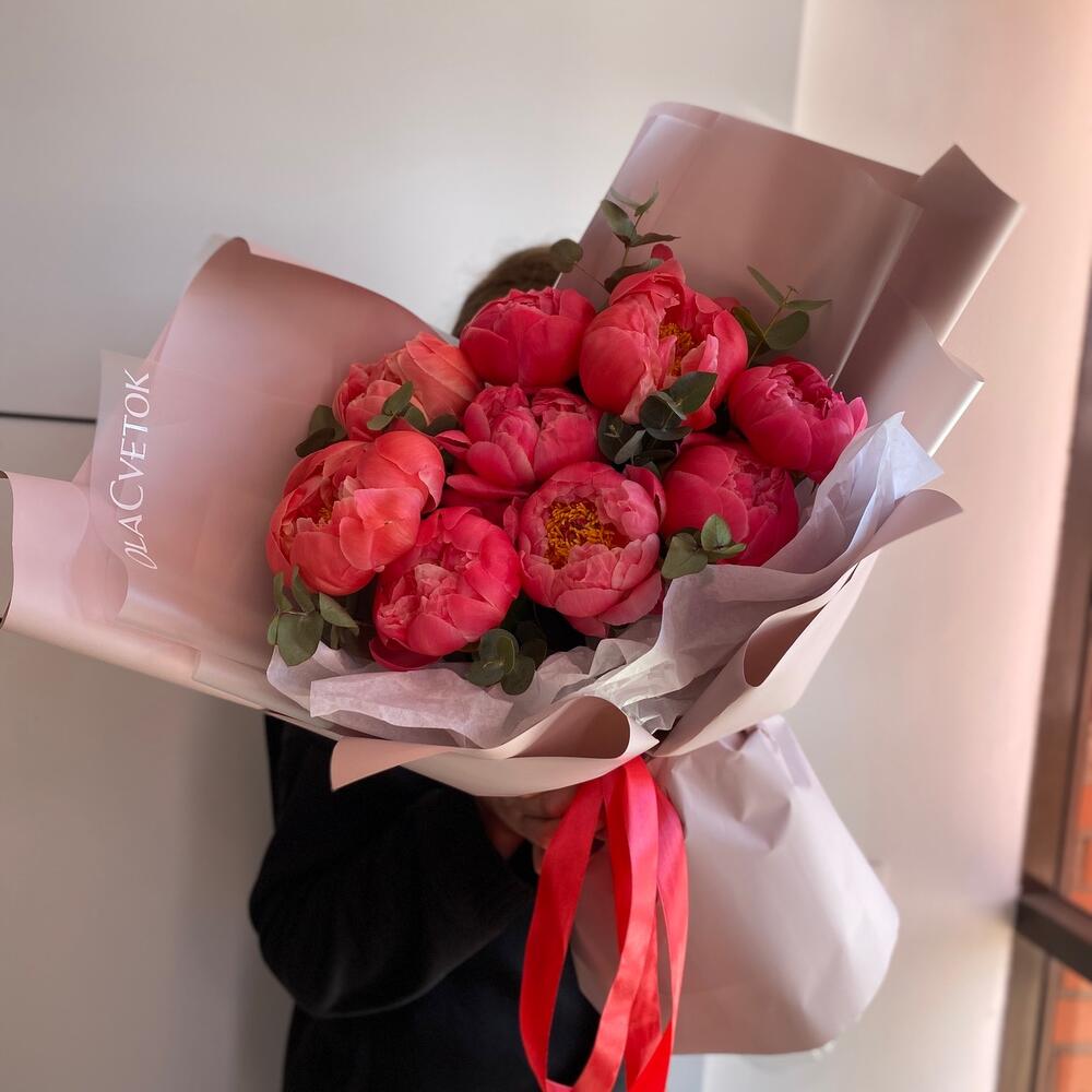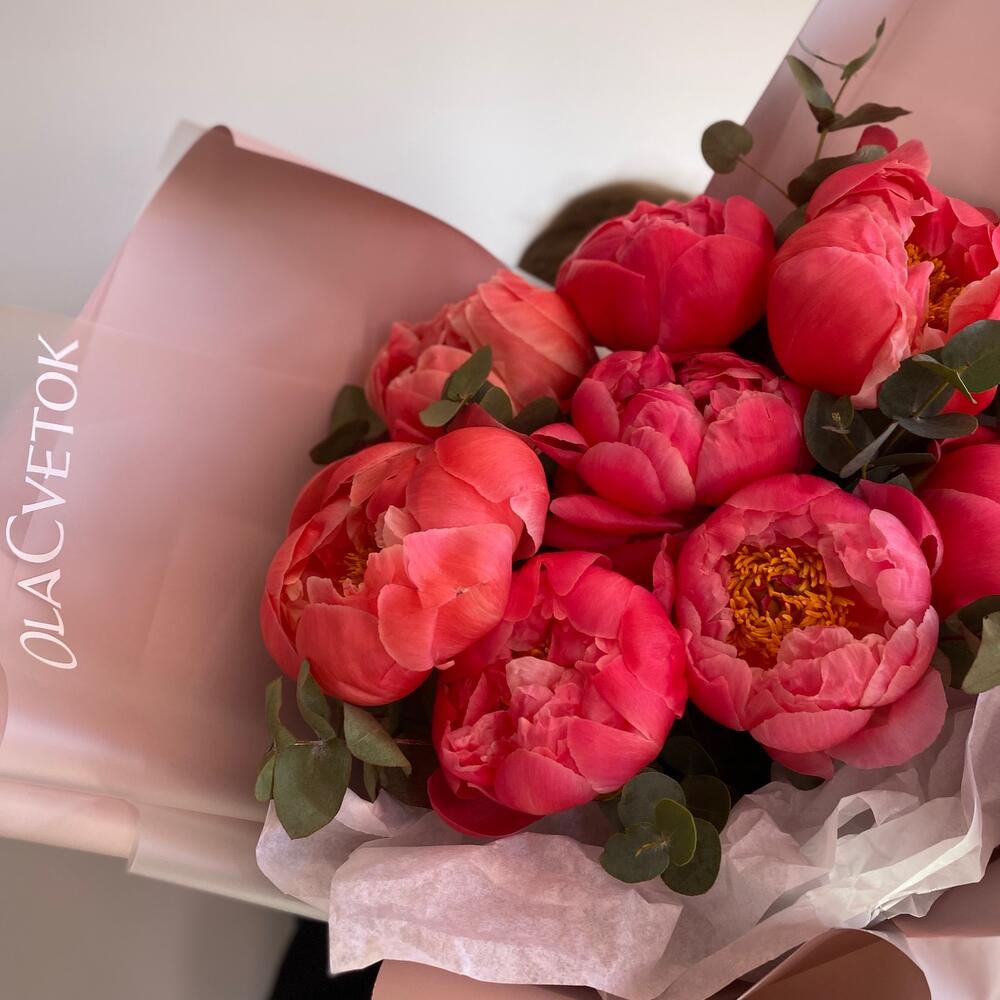 Яркие пионы коралл- шарм , в стильной упаковке от наших флористов ❤️