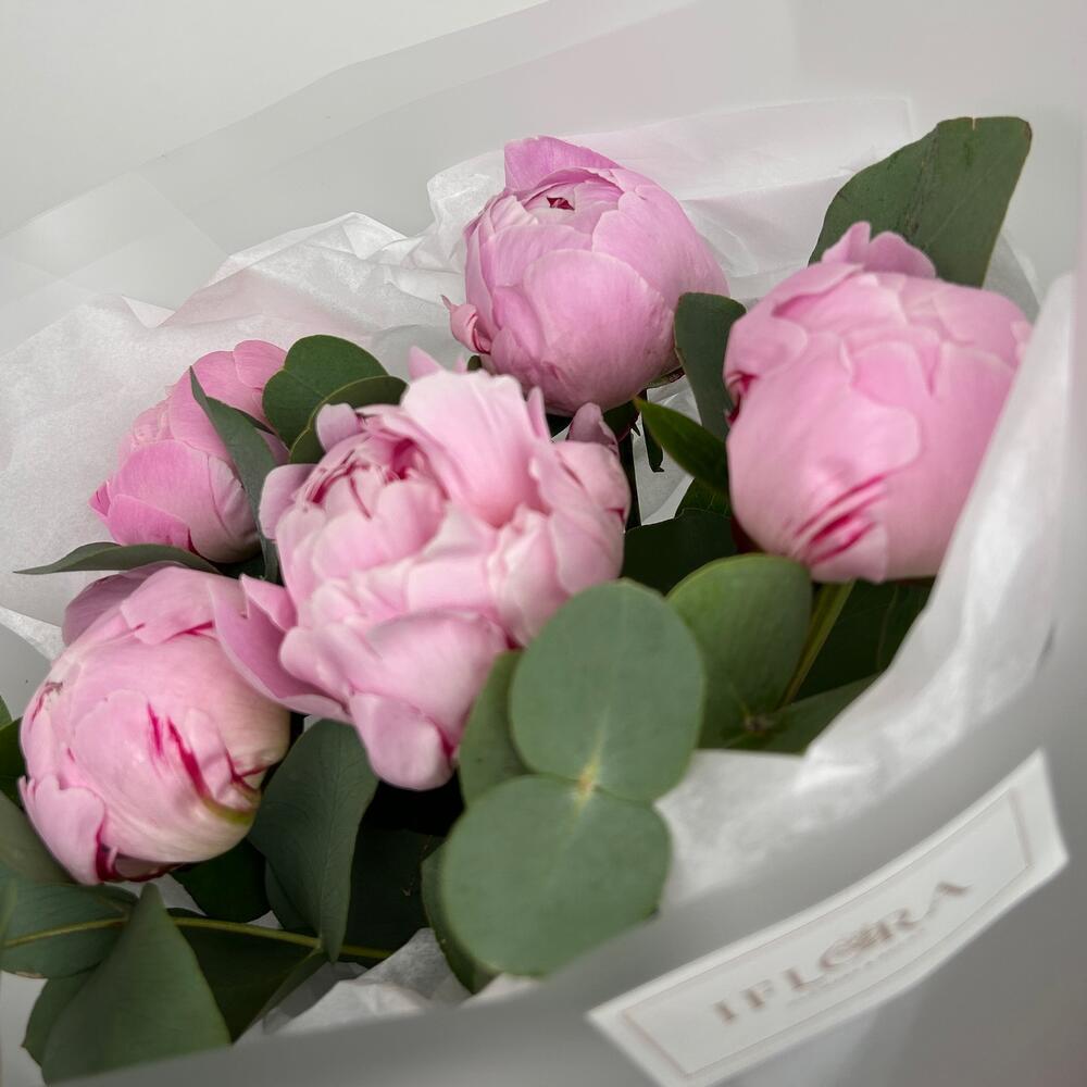 Нежно-розовые пионы 5 шт с эвкалиптом в дизайнерской упаковке – отличный комплимент любой девушкеК букету в качестве подарка подкрепим кризал, инструкцию по уходу за цветами и шоколадку!