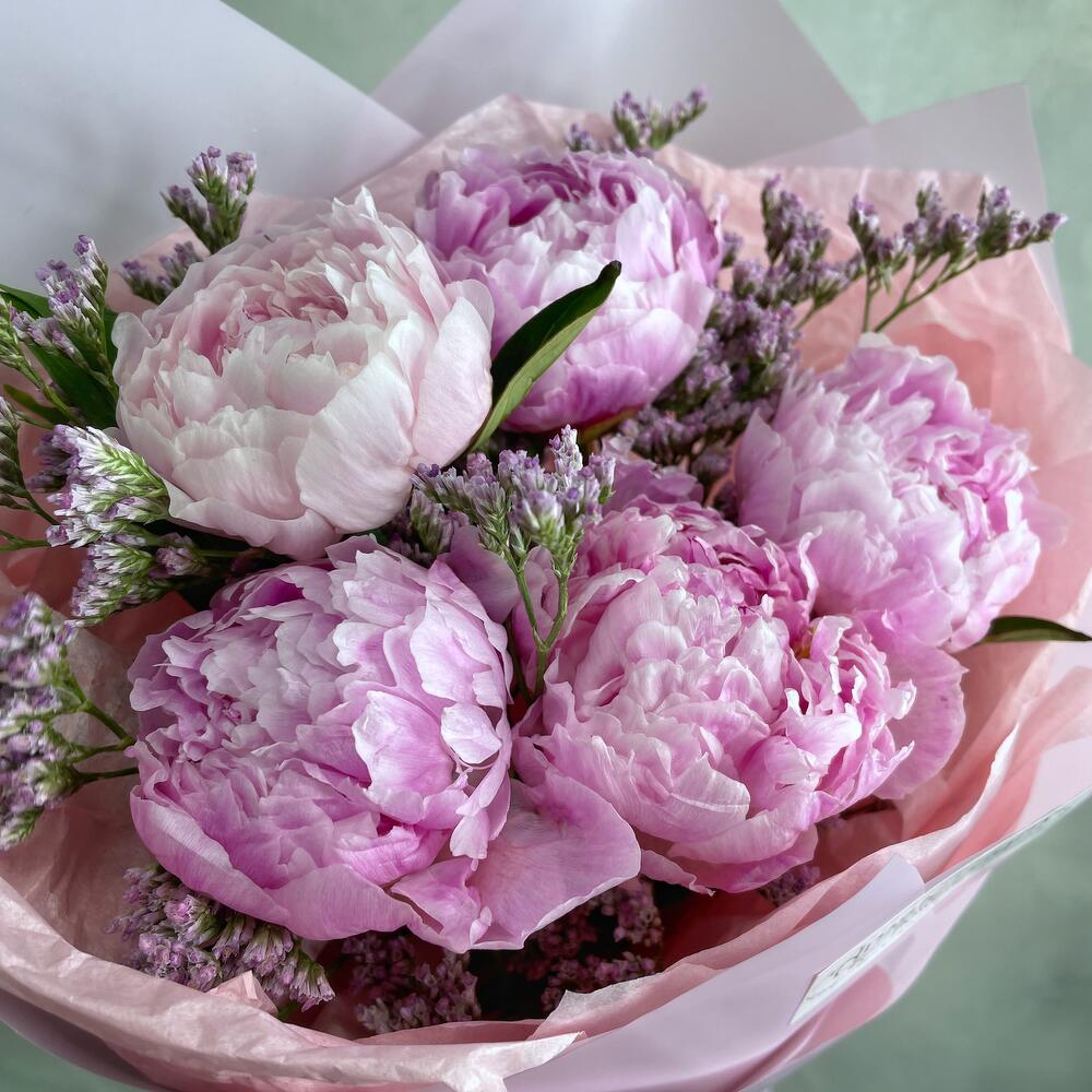 Лимониум – 2 шт.Пион – 5 шт.Упаковка тишью – 2 шт.Упаковка пленка матовая – 2 шт.