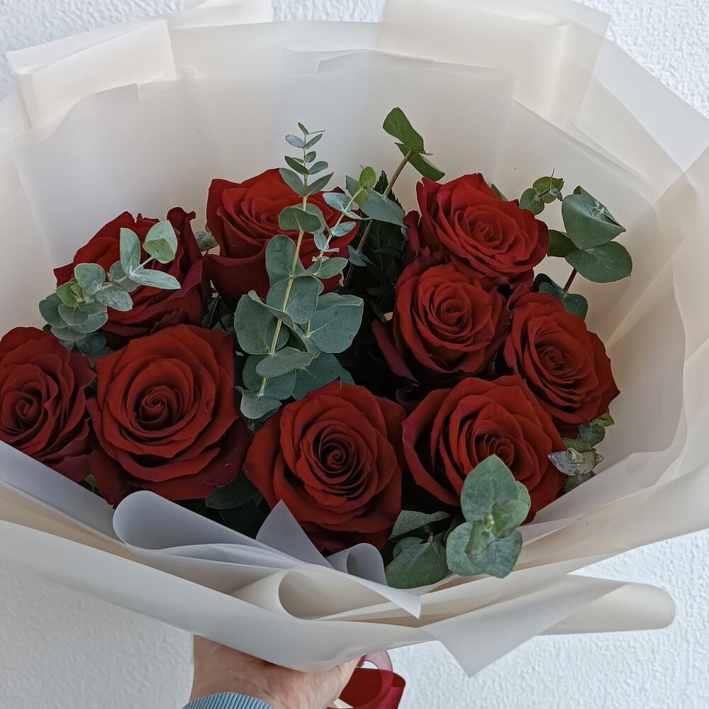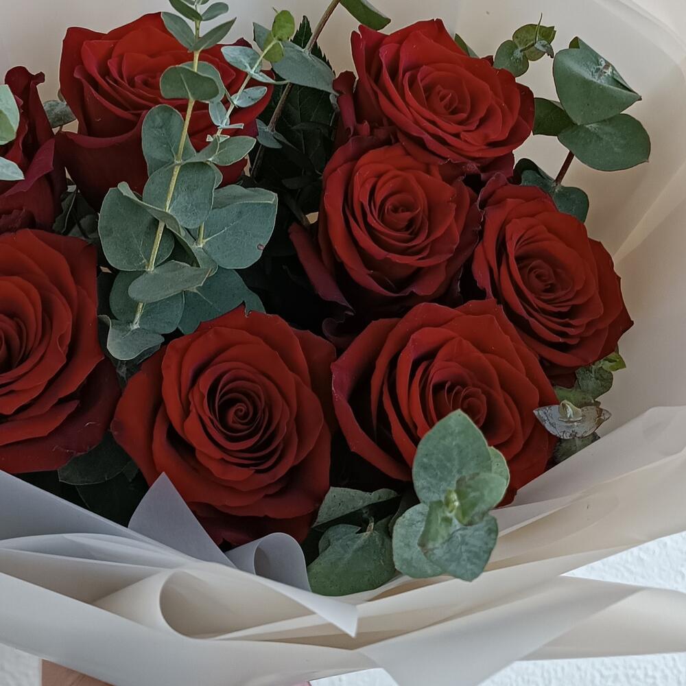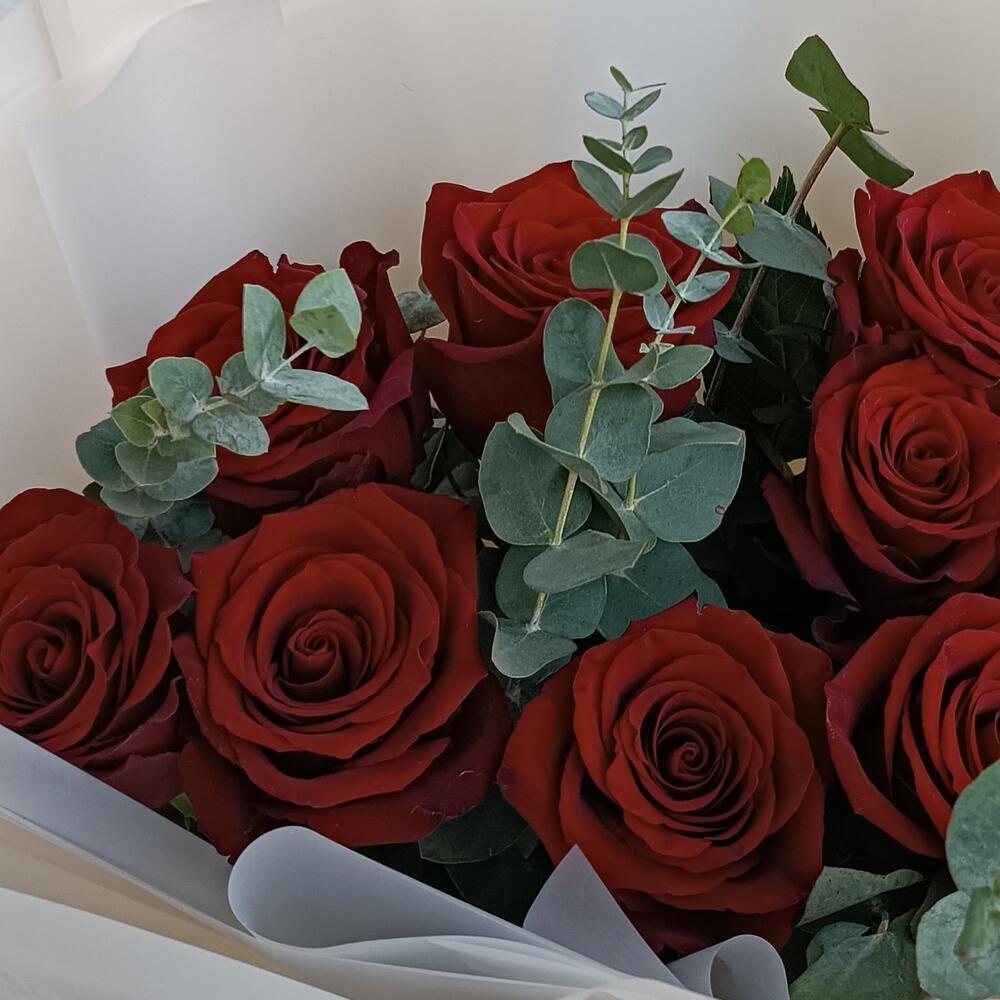 9 роз с эвкалиптом