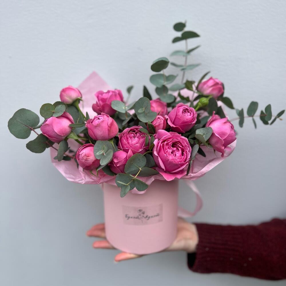 Эвкалипт – 1 шт.Тишью – 1 шт.Роза кустовая пионовидная – 3 шт.Оазис флористический – 1 шт.коробка шляпная 12х15 – 1 шт.