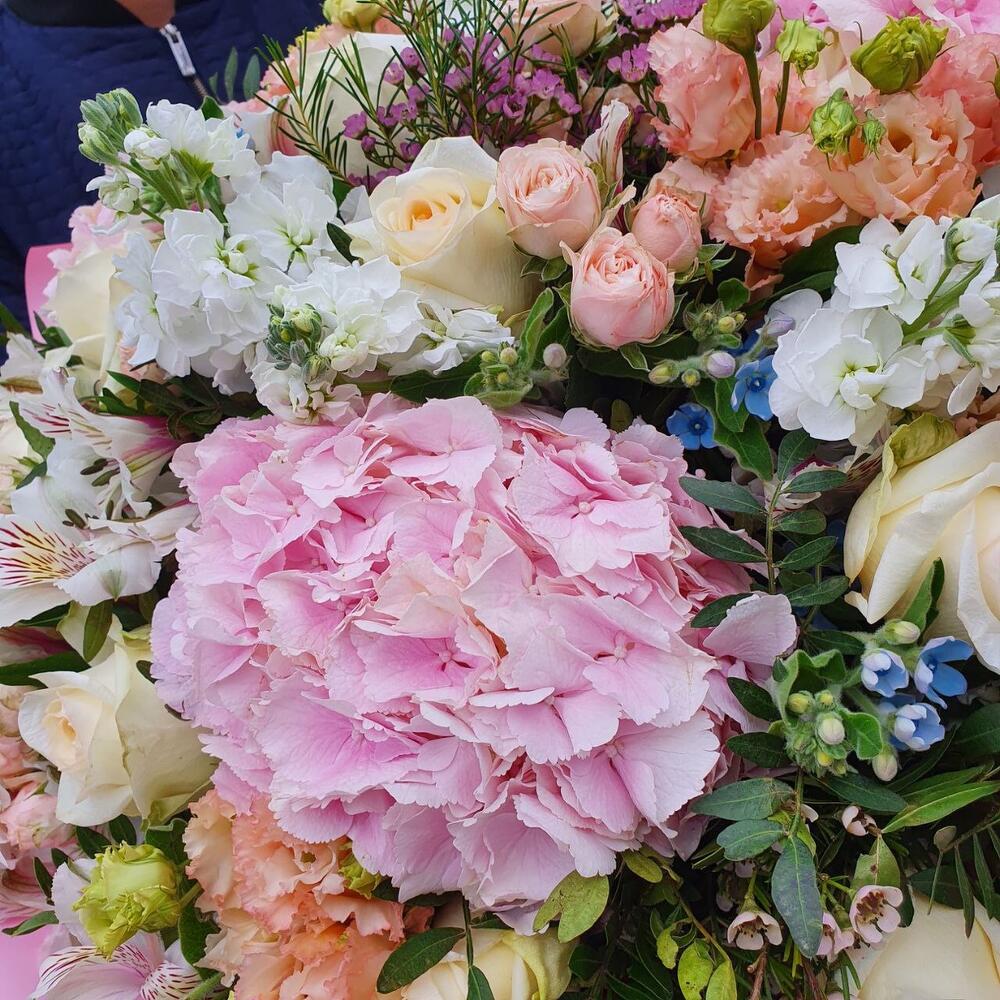 Гортензия розовая – 3 шт.Альстромерия – 10 шт.Маттиола – 10 шт.Лизиантус – 10 шт.Кустовая роза – 10 шт.Твидия – 12 шт.Роза Эквадор – 15 шт.Фисташка – 10 шт.Упаковка дизайнерская – 2 шт.Ваксфлауэр – 5 шт.