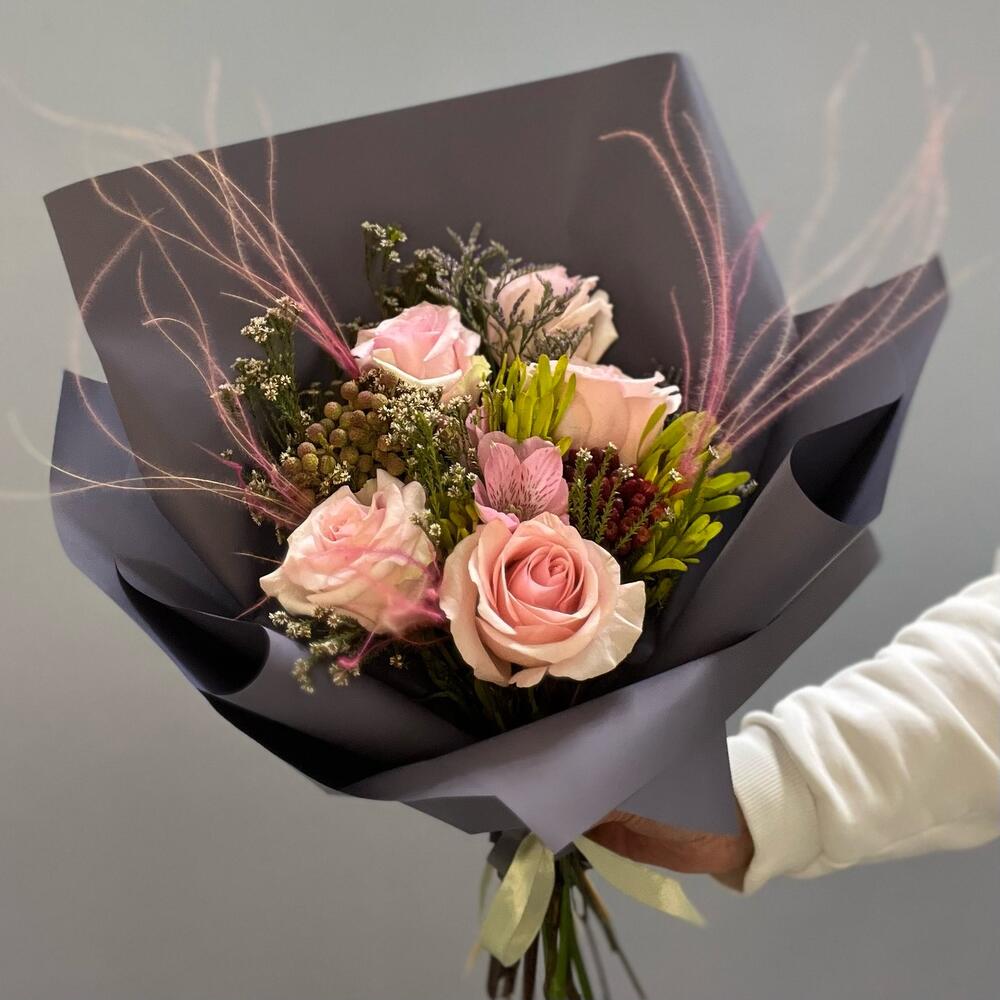 Роза Эквадор – 5 шт.Альстромерия – 1 шт.Ковыль – 2 шт.протейный микс – 1 шт.Упаковка дизайнерская – 1 шт.Лента атласная – 1 шт.