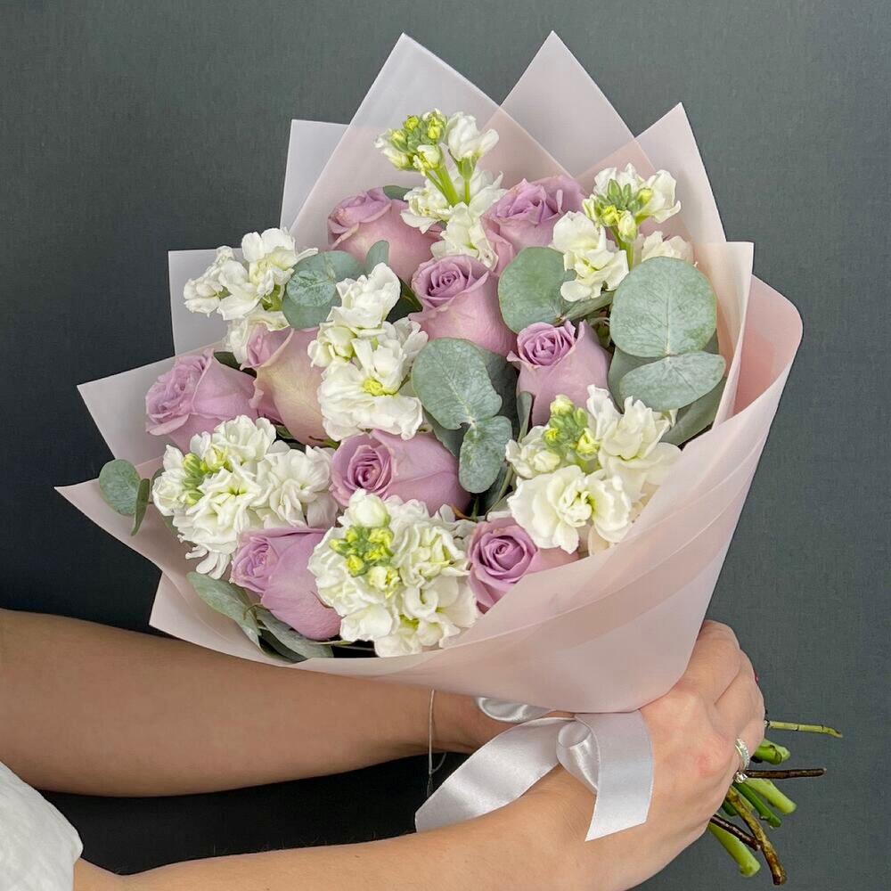 Роза одноголовая – 9 шт.Маттиола – 7 шт.Эвкалипт – 5 шт.бумага дизайнерская – 5 шт.Лента атласная – 1 шт.