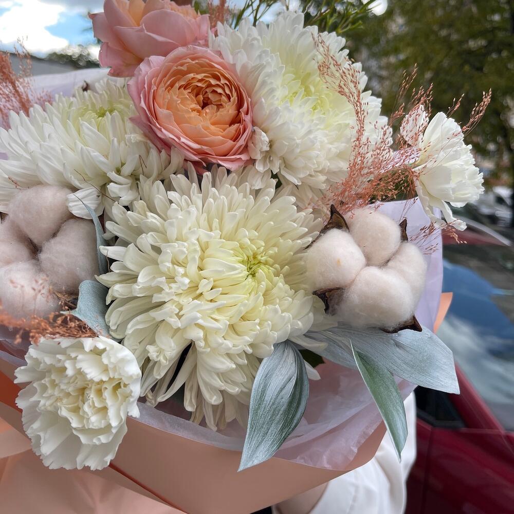 Категорий: Гвоздики, Пионовидные розы, Розы, Сухоцвет, Хризантемы