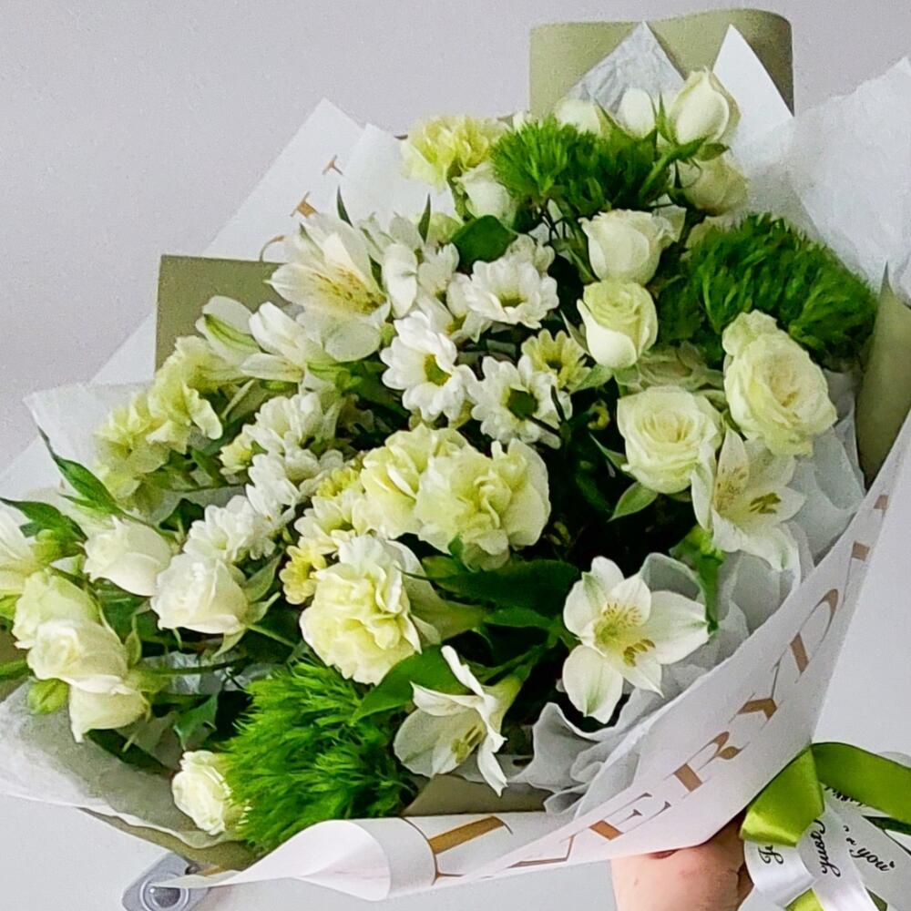 Зелень – 3 шт.Лента атласная – 2 шт.Тишью – 2 шт.Роза кустовая белая – 3 шт.Сантини – 3 шт.Упаковка дизайнерская – 2 шт.Открыточка с вашими пожеланиями – 1 шт.эустома белая – 2 шт.Гвоздика green trick – 3 шт.гвоздика белая сортовая – 3 шт.транспортировочная упаковка – 1 шт.