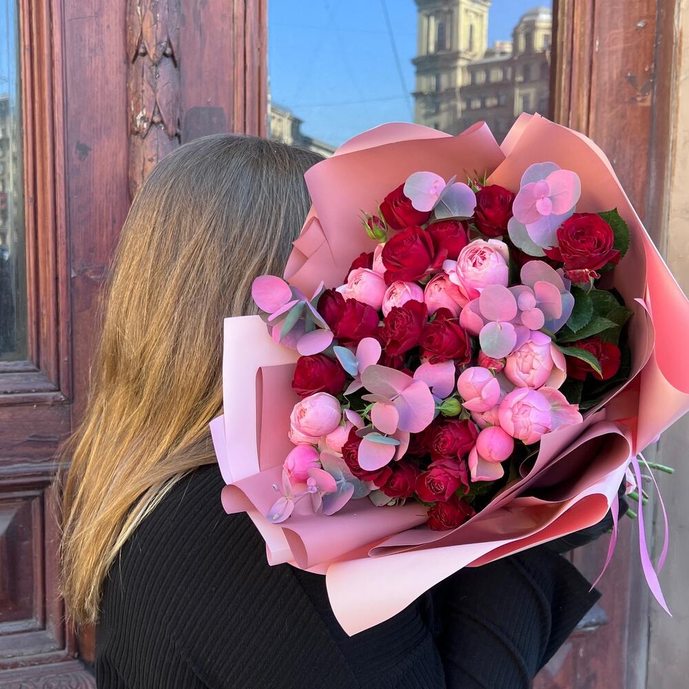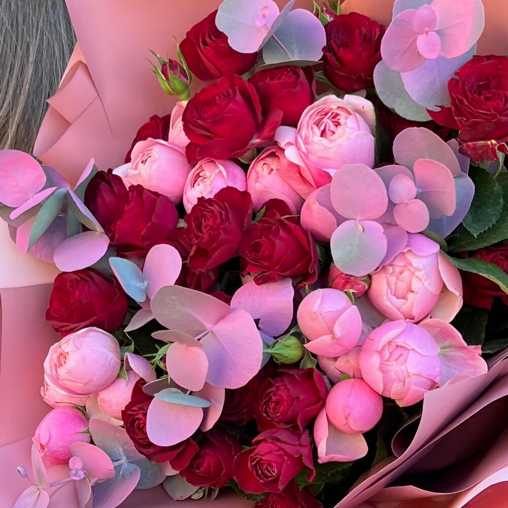 Лента атласная – 2 шт.Пленка матовая – 7 шт.Эвкалипт крашеный – 3 шт.роза кустовая пионовидная сильва пинк – 4 шт.роза кустовая ред трендсеттер – 5 шт.