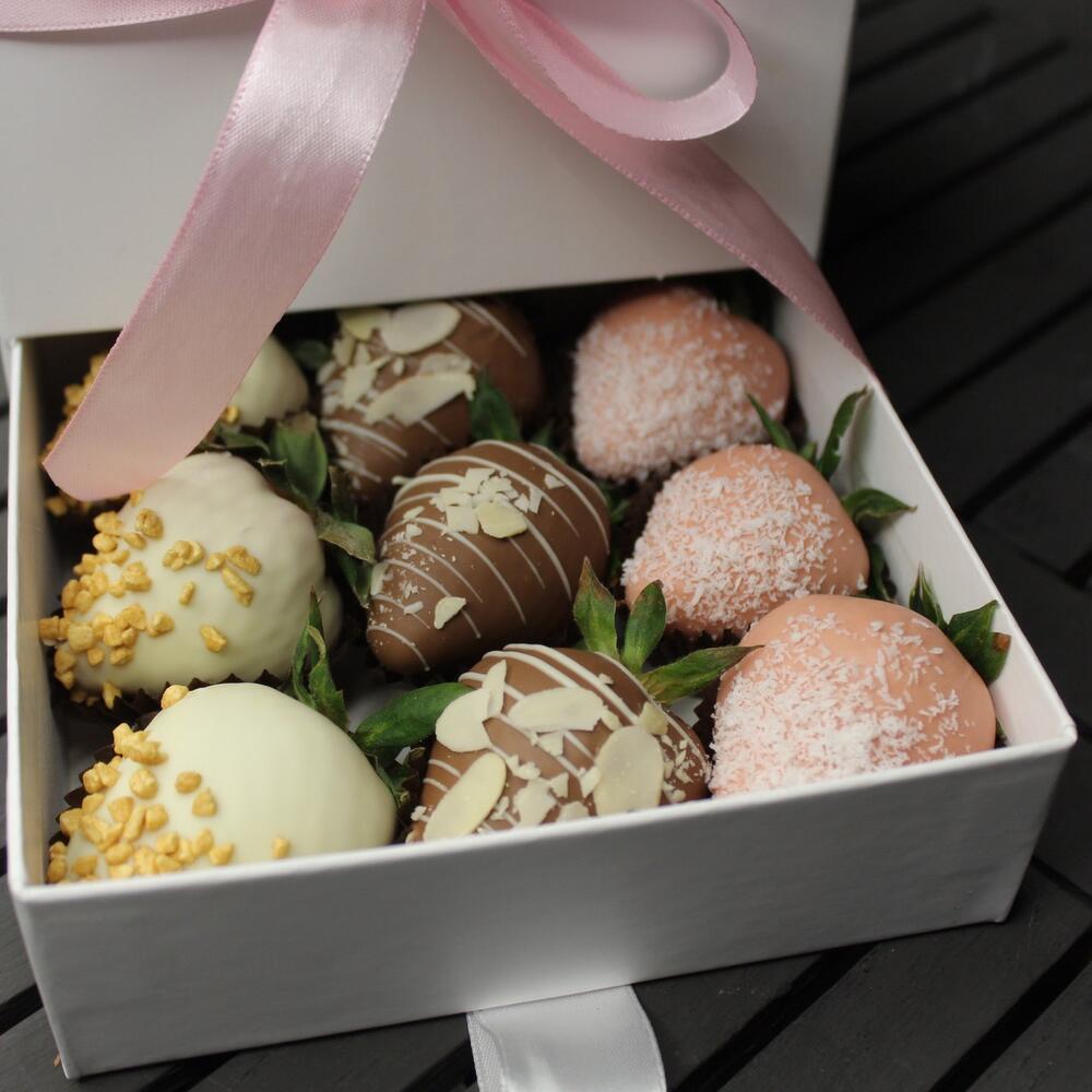 Клубника в шоколаде – 9 шт.мадам бомбастик роза кустовая пионовидная – 6 шт.эустома белая – 3 шт.Эвкалипт – 2 шт.Оазис флористический – 1 шт.Коробка квадратная – 1 шт.Лента атласная – 1 шт.