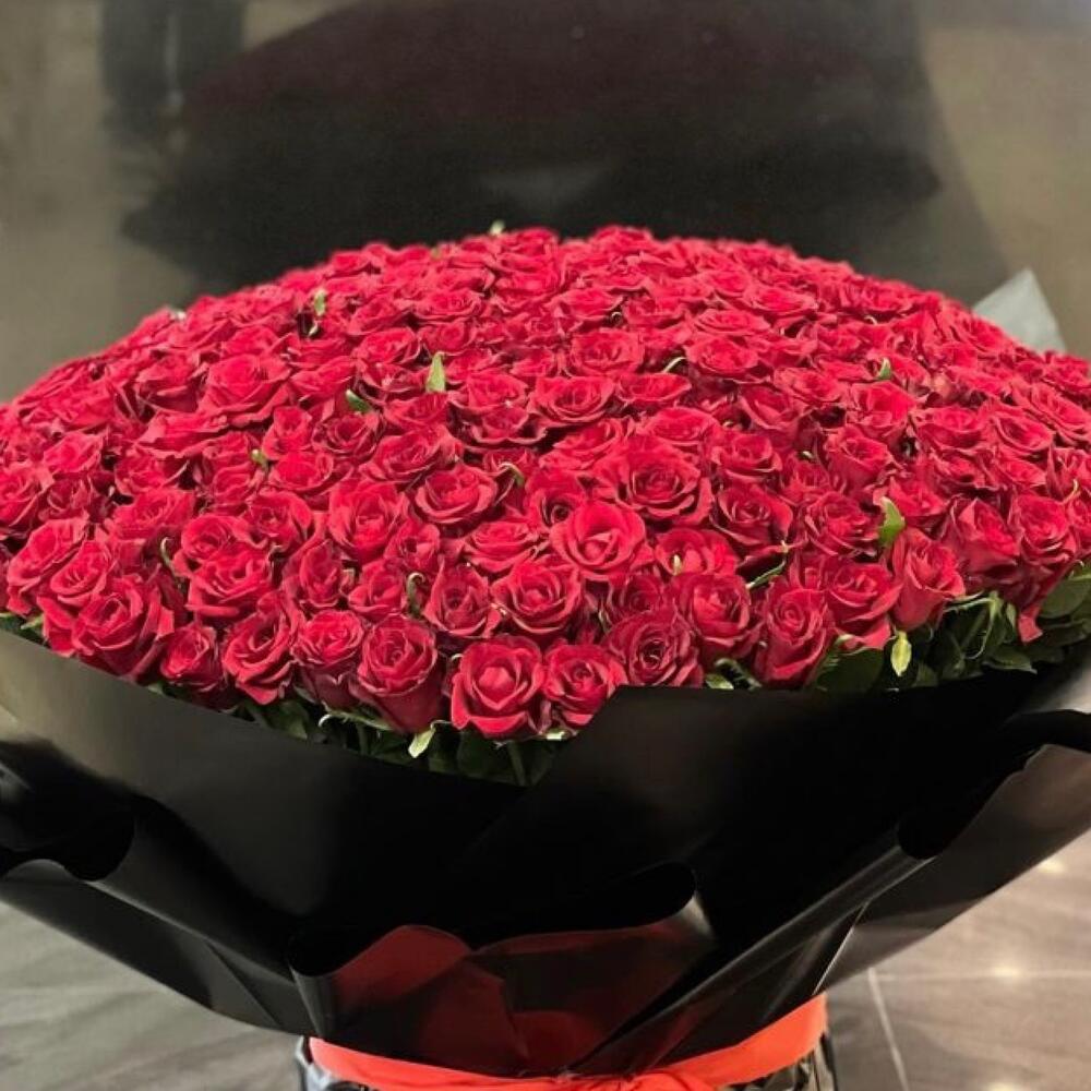 Роза алая – 201 шт.Дизайнерская упаковка – 2 шт.Лента атласная – 2 шт.Открытка – 1 шт.инструкция по уходу за цветами – 1 шт.коробка переноска – 1 шт.клизал – 1 шт.