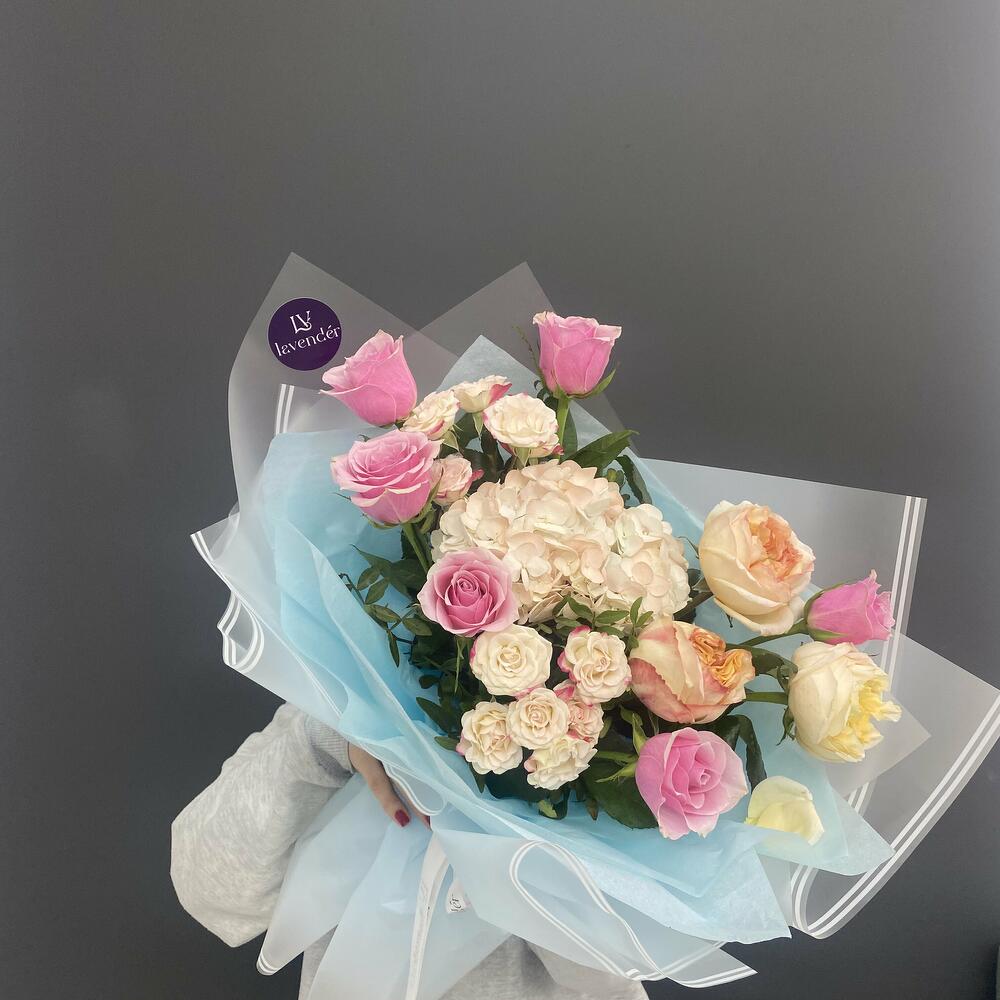 Альстромерии, Гвоздики, Кустовые розы, Лизиантусы, Розы, Хризантемы