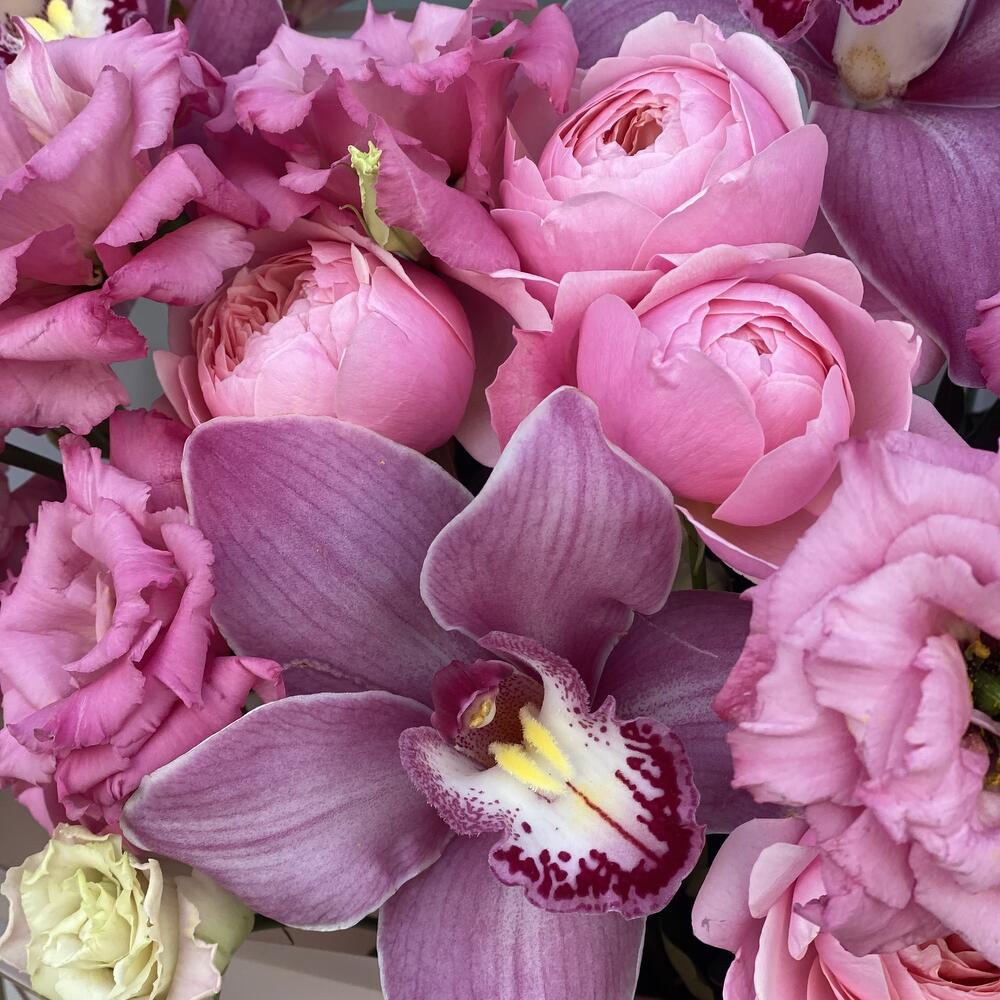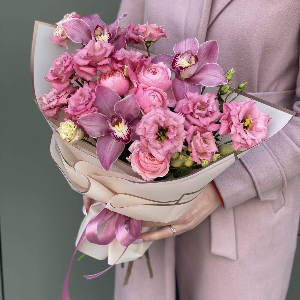 Сборный букет из кружевной эустомы сорта Алиса Роуз, цветков орхидеи и кустовой пионовидной розы в оформлении!