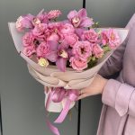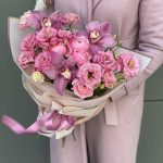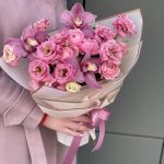 эустома алиса роуз – 4 шт. ЦИМБИДИУМ – 3 шт. Писташ – 2 шт. Кустовая пионовидная роза – 1 шт. Оформление – 1 шт.