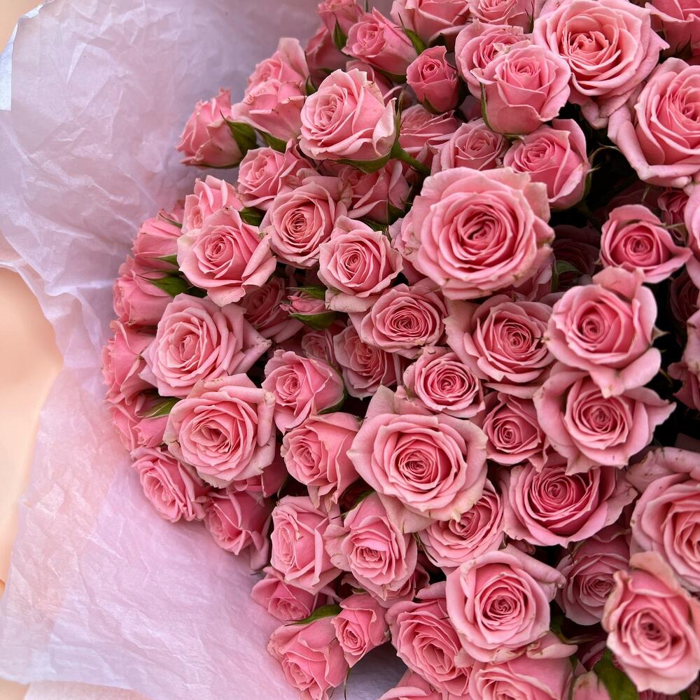 Роза кустовая 60 см – 25 шт.Дизайнерская упаковка – 5 шт.Тишью – 1 шт.Лента атласная – 2 шт.