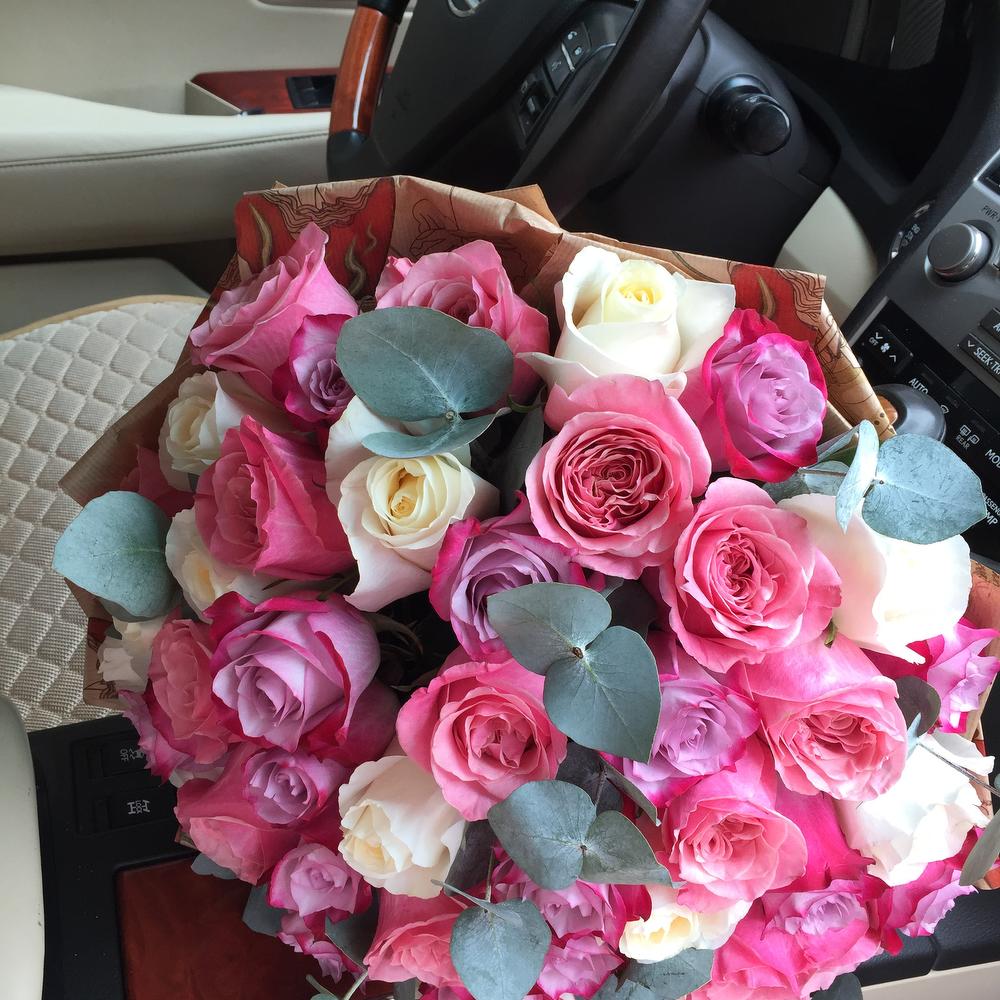 Эвкалипт – 3 шт. Роза сиреневая – 21 шт. Крафт упаковка – 1 шт. Роза розовая 60 см – 20 шт. Роза белая 60 см – 10 шт.