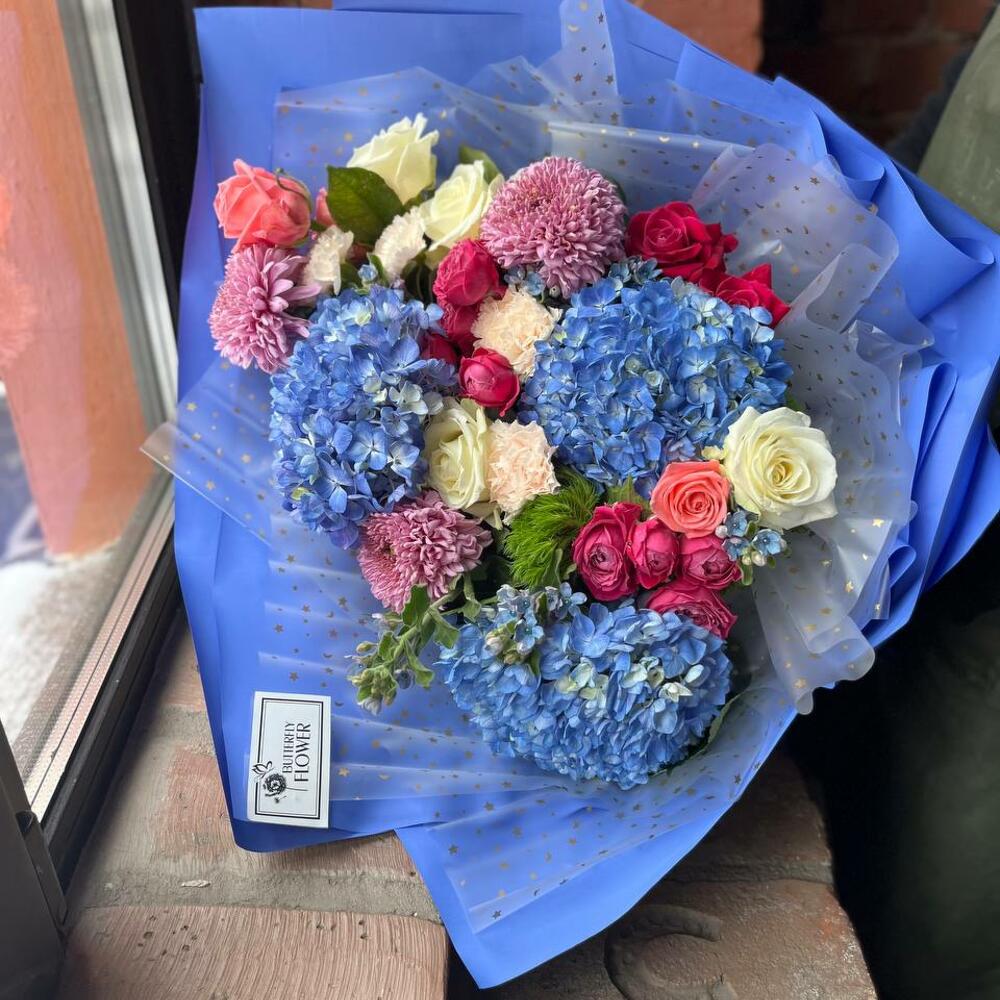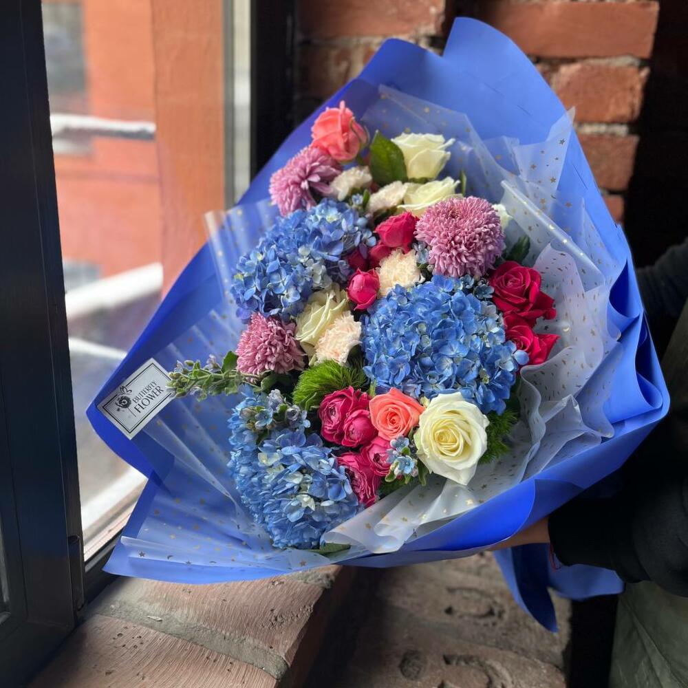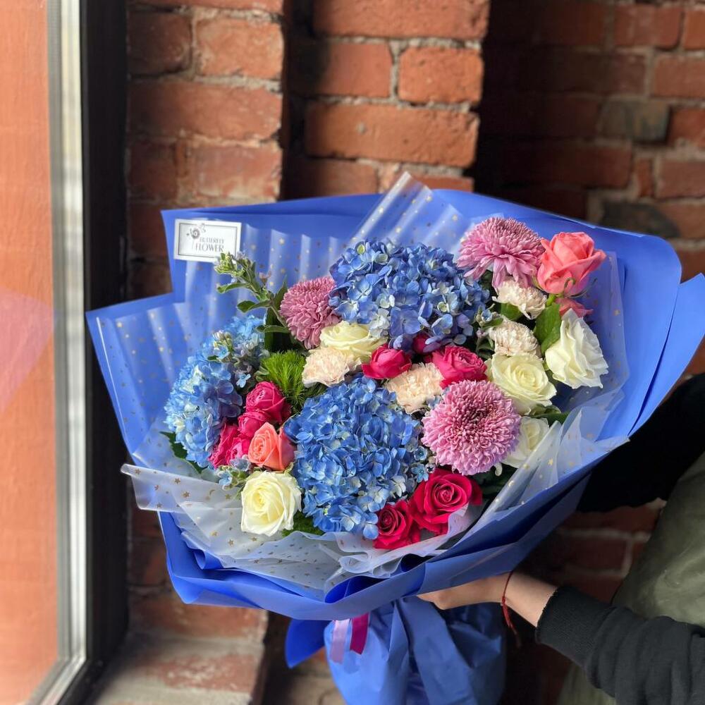 Букет из гортензии, хризантемы, гвоздики, оксипеталума и роз в стильной упаковке “Ласковый ветерок”