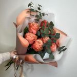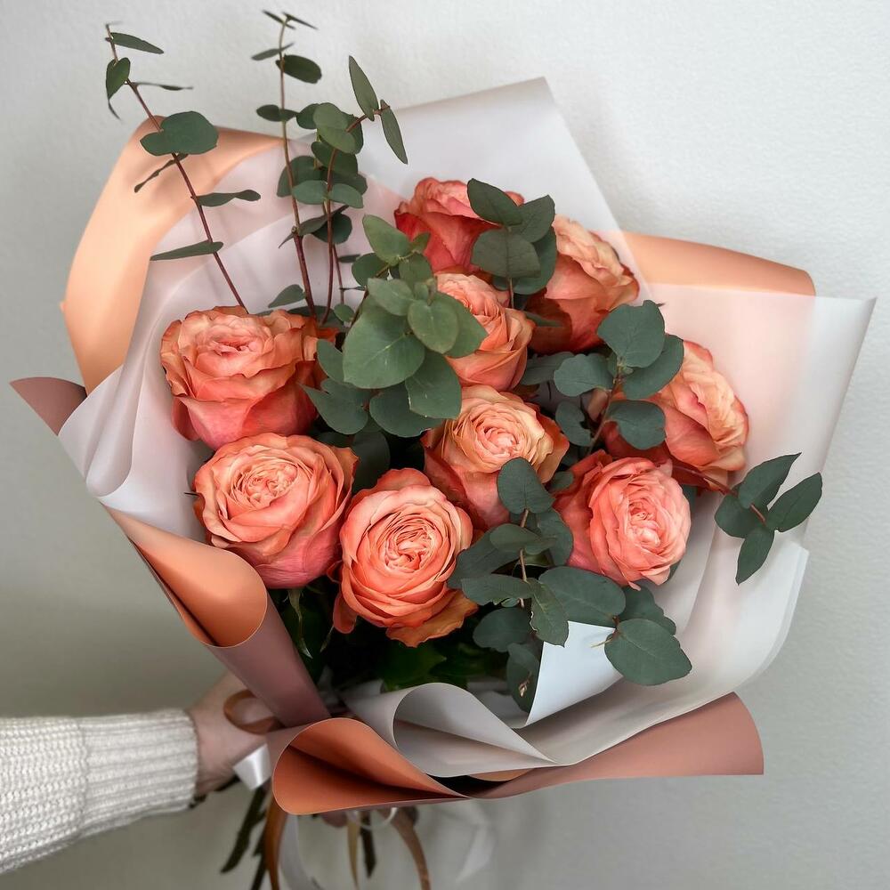 Пионовидная роза одноголовая – 9 шт.Эвкалипт – 3 шт.Рускус – 5 шт.Упаковка дизайнерская – 3 шт.