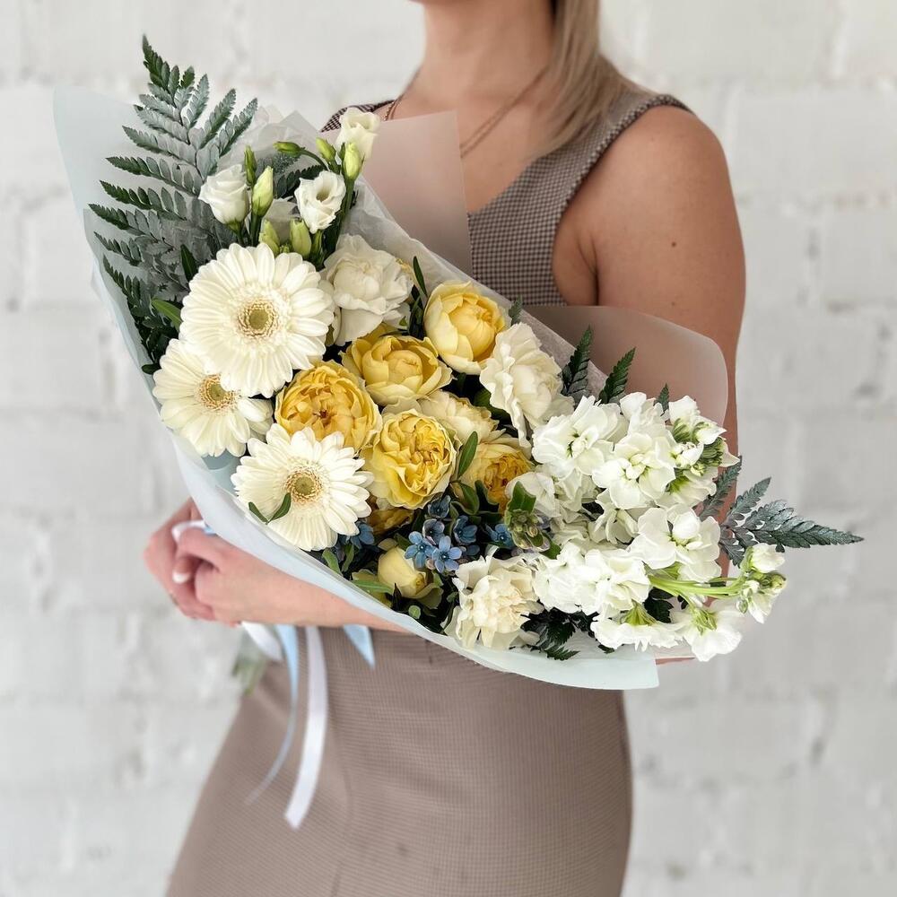 Маттиола – 3 шт.Папоротник – 2 шт.Гербера – 3 шт.Диантус – 3 шт.Фисташка – 5 шт.Оксипеталум – 2 шт.Упаковка дизайнерская – 3 шт.Пионовидная кустовая роза – 2 шт.эустома белая – 2 шт.