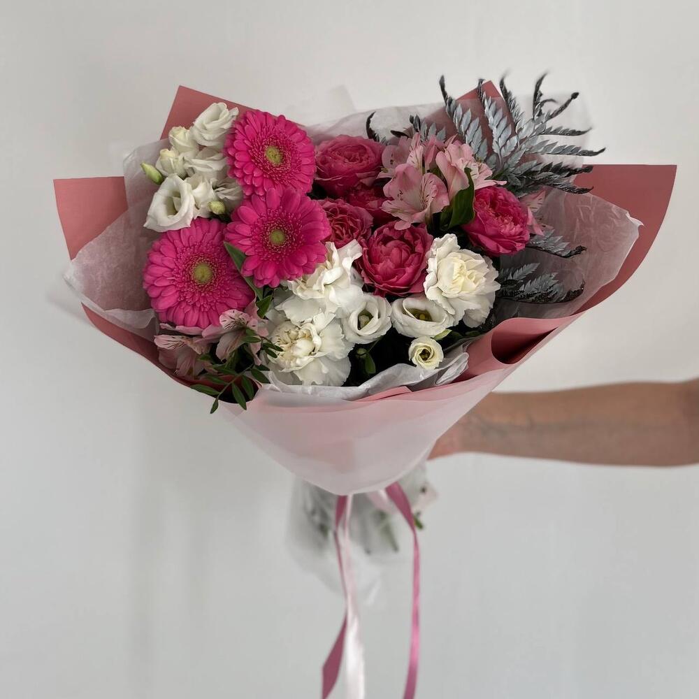Альстромерия – 2 шт.Папоротник – 1 шт.Гербера – 3 шт.Диантус – 3 шт.Фисташка – 5 шт.Пионовидная кустовая роза – 2 шт.эустома белая – 2 шт.Дизайнерская упаковка – 3 шт.