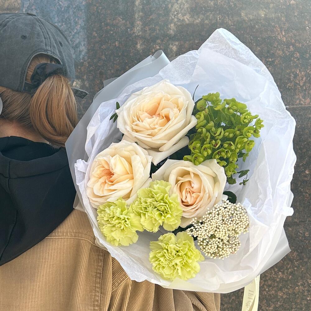 Роза Охара – 3 шт.Эуфорбия – 1 шт.Диантус – 2 шт.Озотамнус – 1 шт.Фисташка – 1 шт.Дизайнерская упаковка – 1 шт.