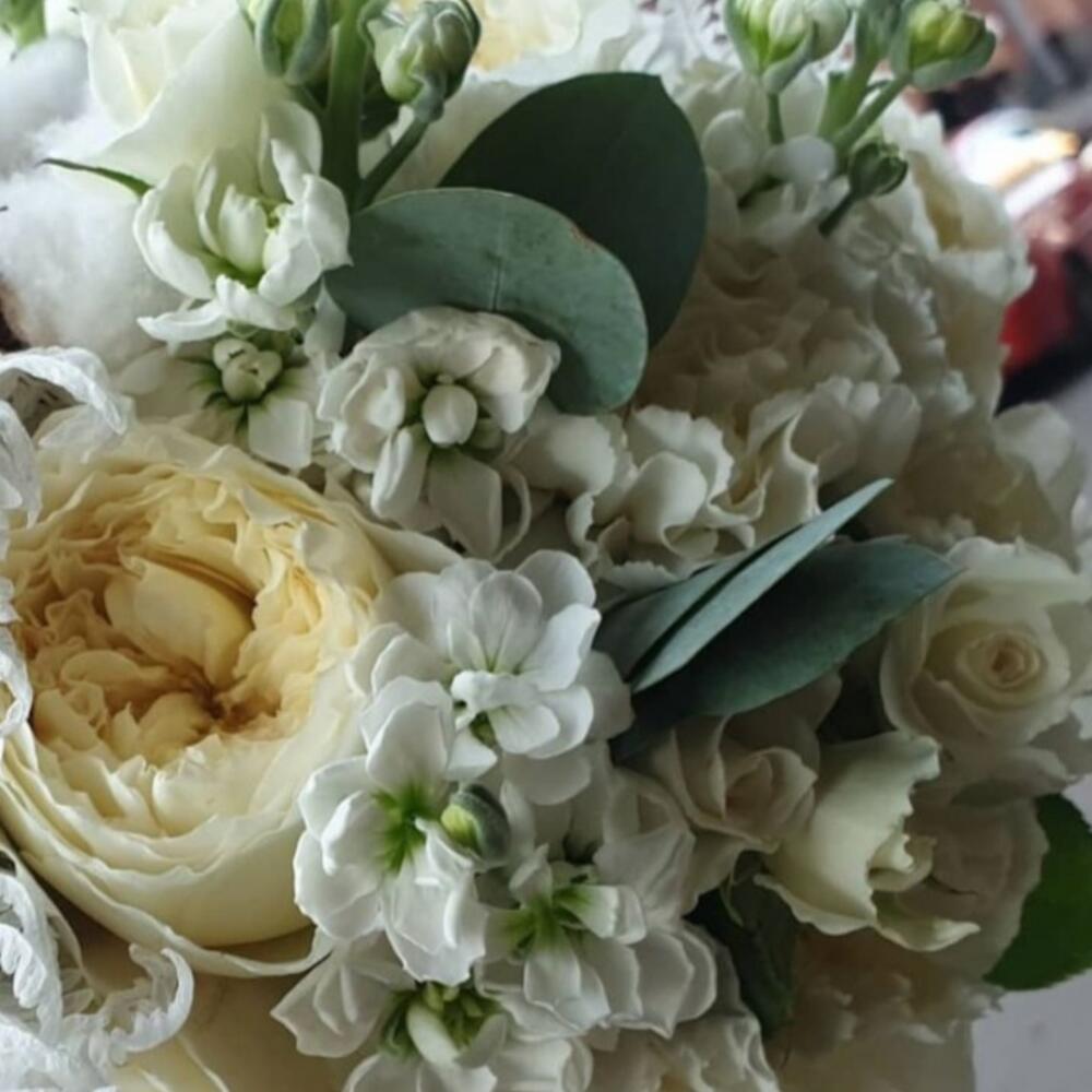 Хлопок натуральный – 3 шт.Роза пионовидная одноголовая – 9 шт.Маттиола белая – 7 шт.Диантус – 9 шт.Роза кустовая – 6 шт.Сухоцвет – 5 шт.Лента атласная – 3 шт.