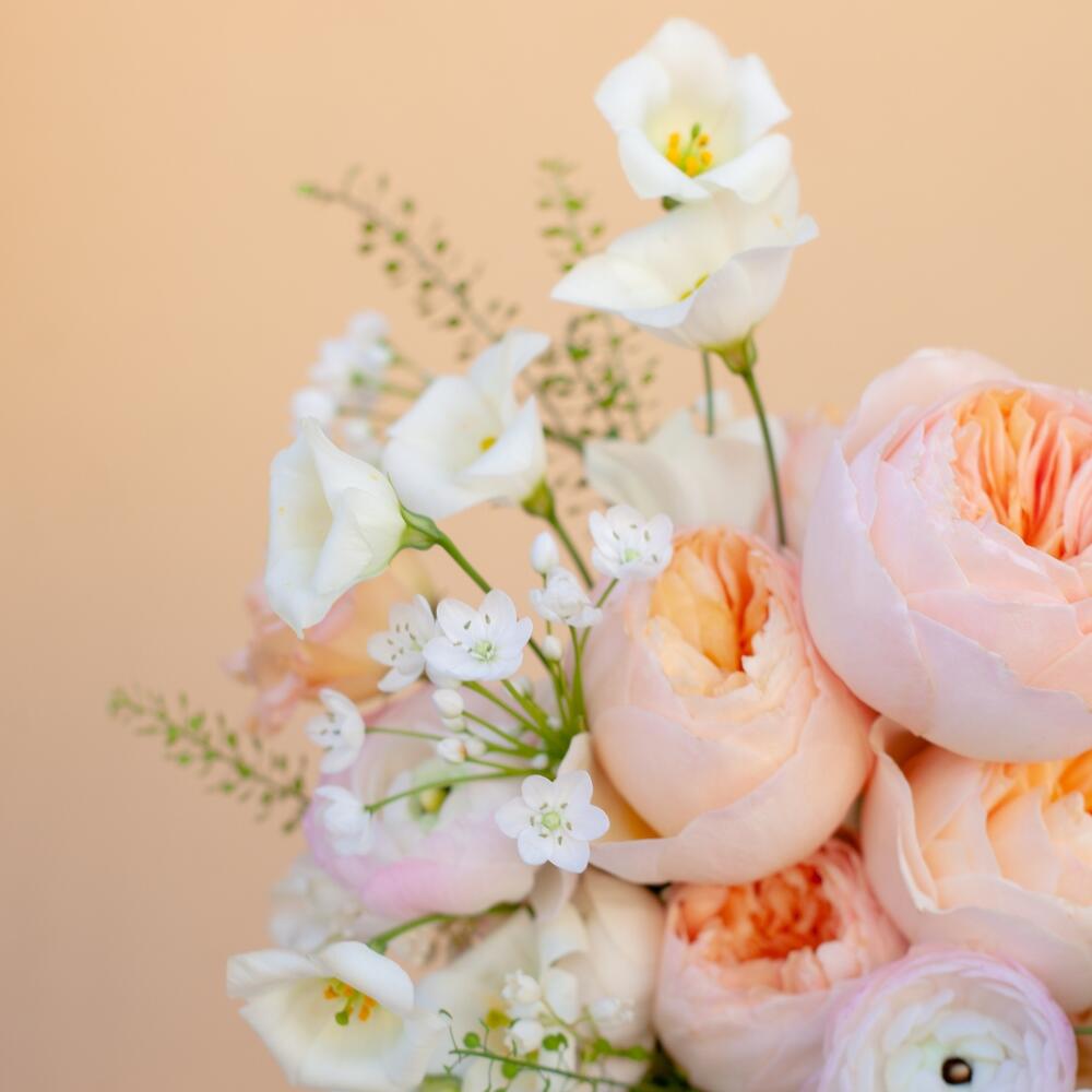 Роза джульетта дэвида остина – 5 шт.лизиантус ботаника – 1 шт.Аллиум – 3 шт.Роза кустовая – 1 шт.Лизиантус – 2 шт.Ранункулюс – 3 шт.сумку-переноска – 1 шт.ваза картонная – 1 шт.