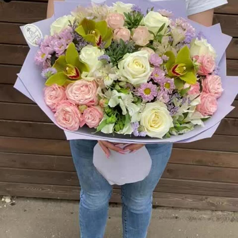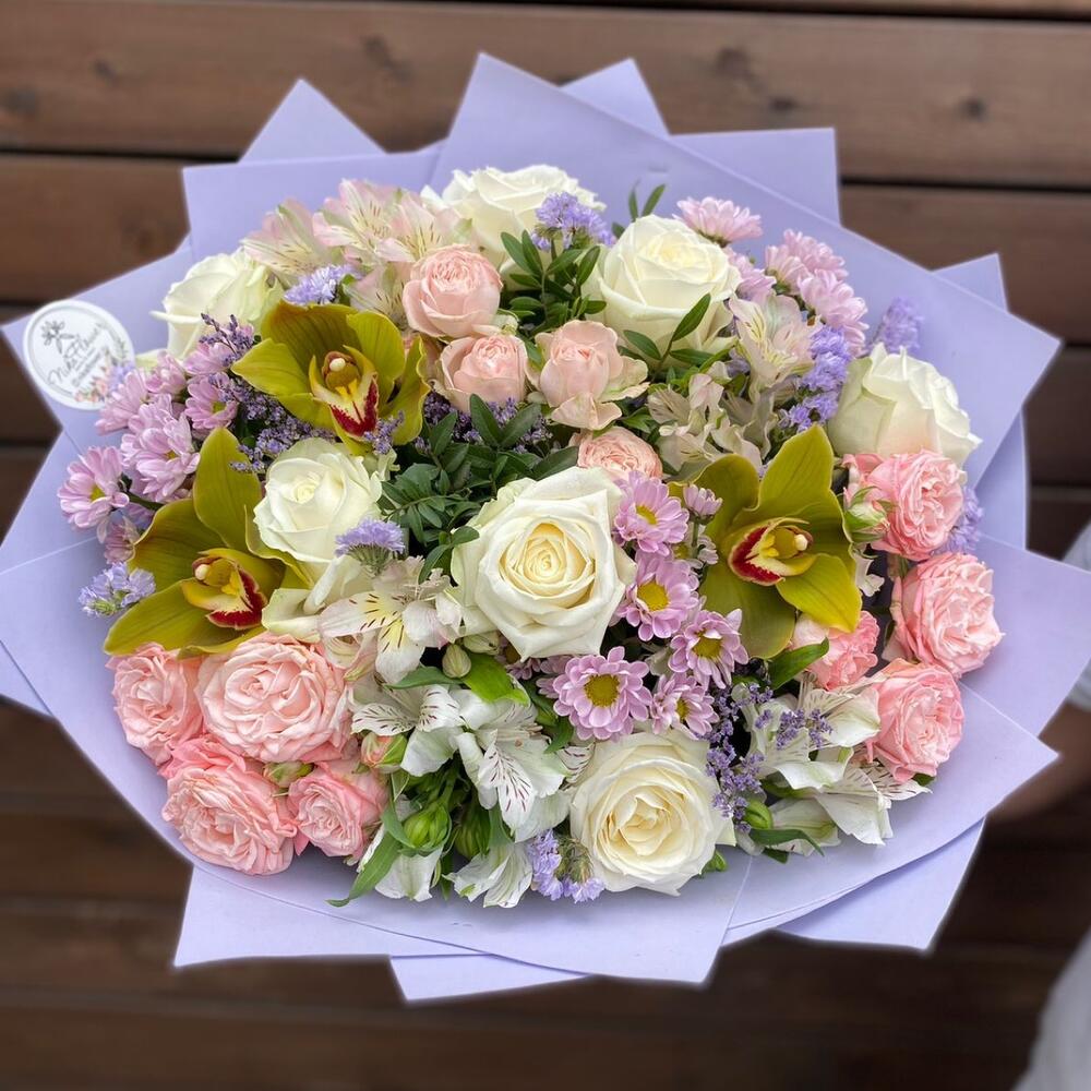 Альстромерия – 4 шт.Лимониум – 1 шт.Орхидея Цимбидиум – 3 шт.Писташ – 3 шт.Статица – 2 шт.Роза – 7 шт.Сантини – 3 шт.Бомбастик – 3 шт.Фоамиран (упаковка) – 1 шт.