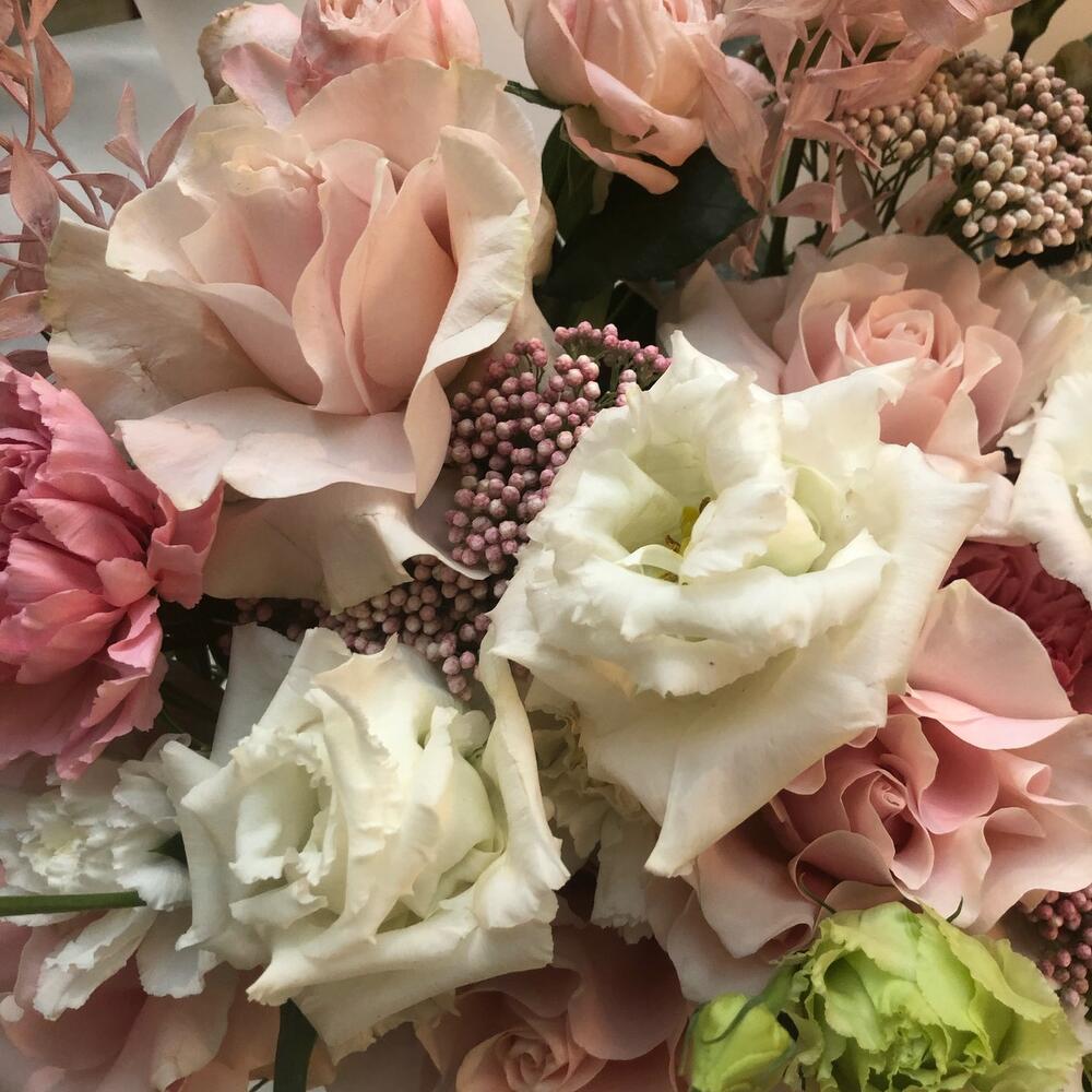 Роза пинк мондиаль – 7 шт.Лизиантус Алиса белый – 5 шт.Гвоздика сортовая – 7 шт.Озотамнус розовый – 3 шт.Сухоцветы – 2 шт.Эвкалипт Baby Blue – 5 шт.Упаковка дизайнерская – 4 шт.Лента – 3 шт.
