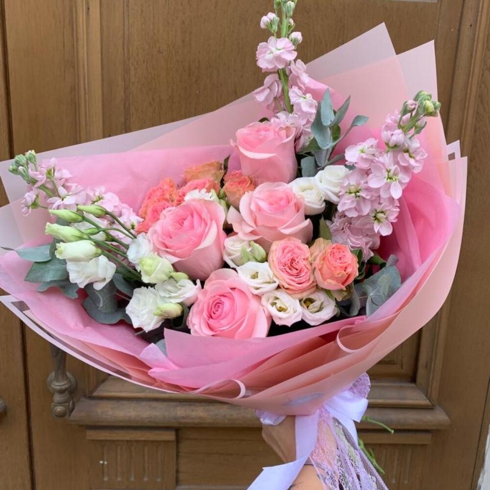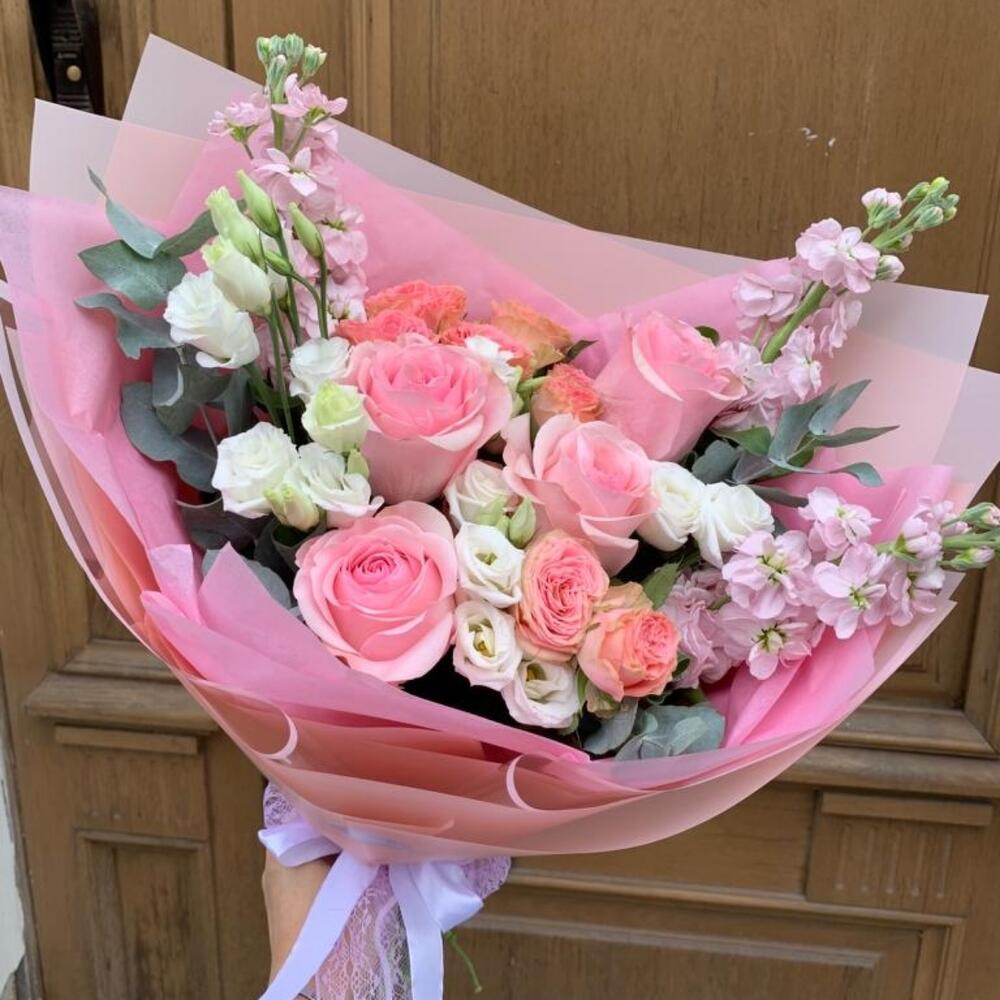 Роза розовая – 4 шт.Роза кустовая – 2 шт.Лизиантус – 2 шт.Маттиола – 3 шт.Дизайнерская упаковка – 1 шт.октрыточка с вашими пожеланиями – 1 шт.Шоколадка – 1 шт.