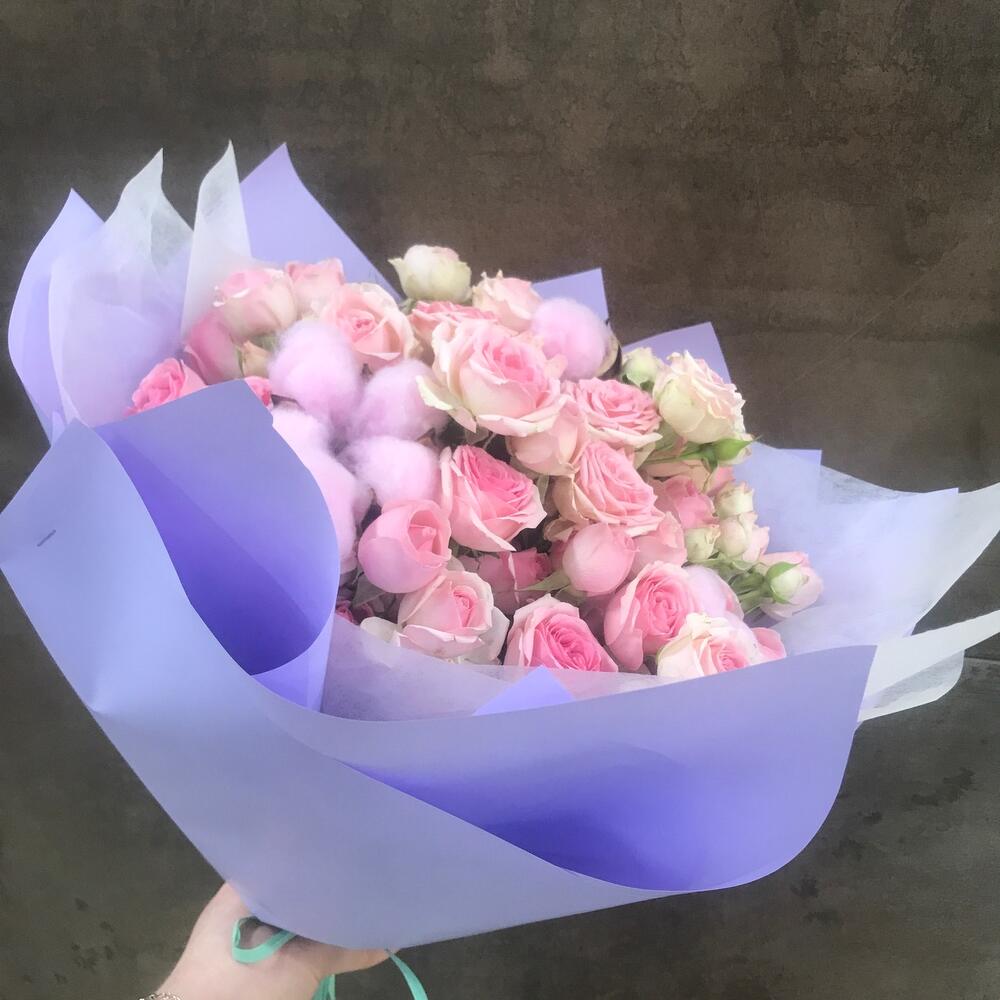 Роза кустовая розовая – 11 шт.Хлопок – 3 шт.Упаковка дизайнерская – 1 шт.Лента атласная – 1 шт.
