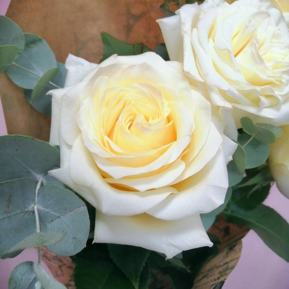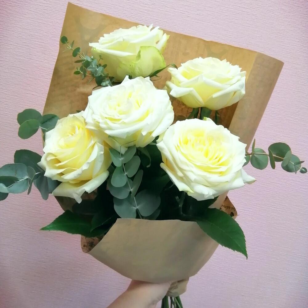 Роза пионовидная – 5 шт.Эвкалипт – 5 шт.Упаковка крафт – 1 шт.
