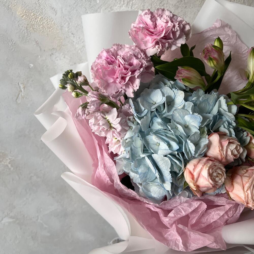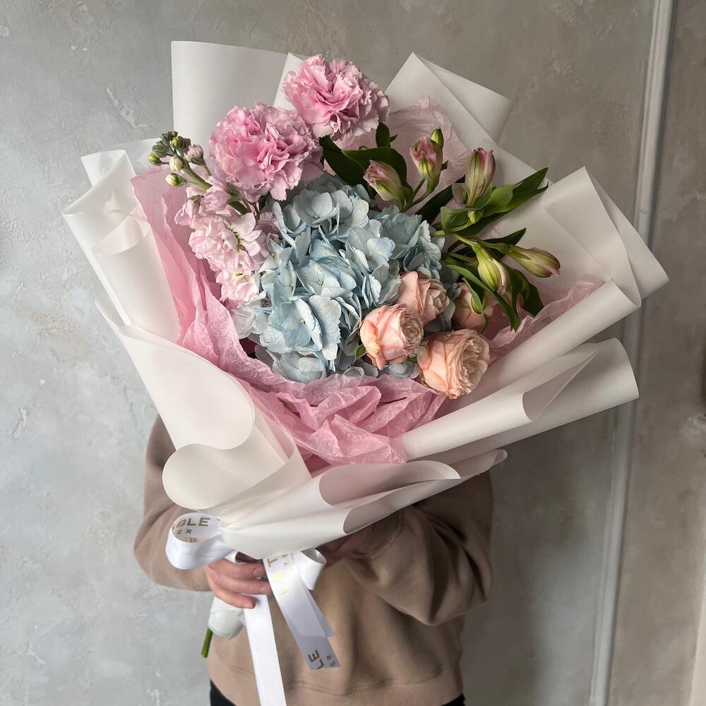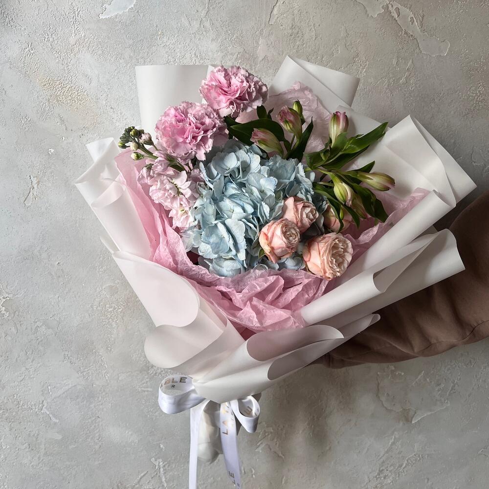Гортензия – 1 шт.Маттиола – 1 шт.Гвоздика – 1 шт.Роза кустовая – 1 шт.Альстромерия – 1 шт.Упаковка дизайнерская – 1 шт.
