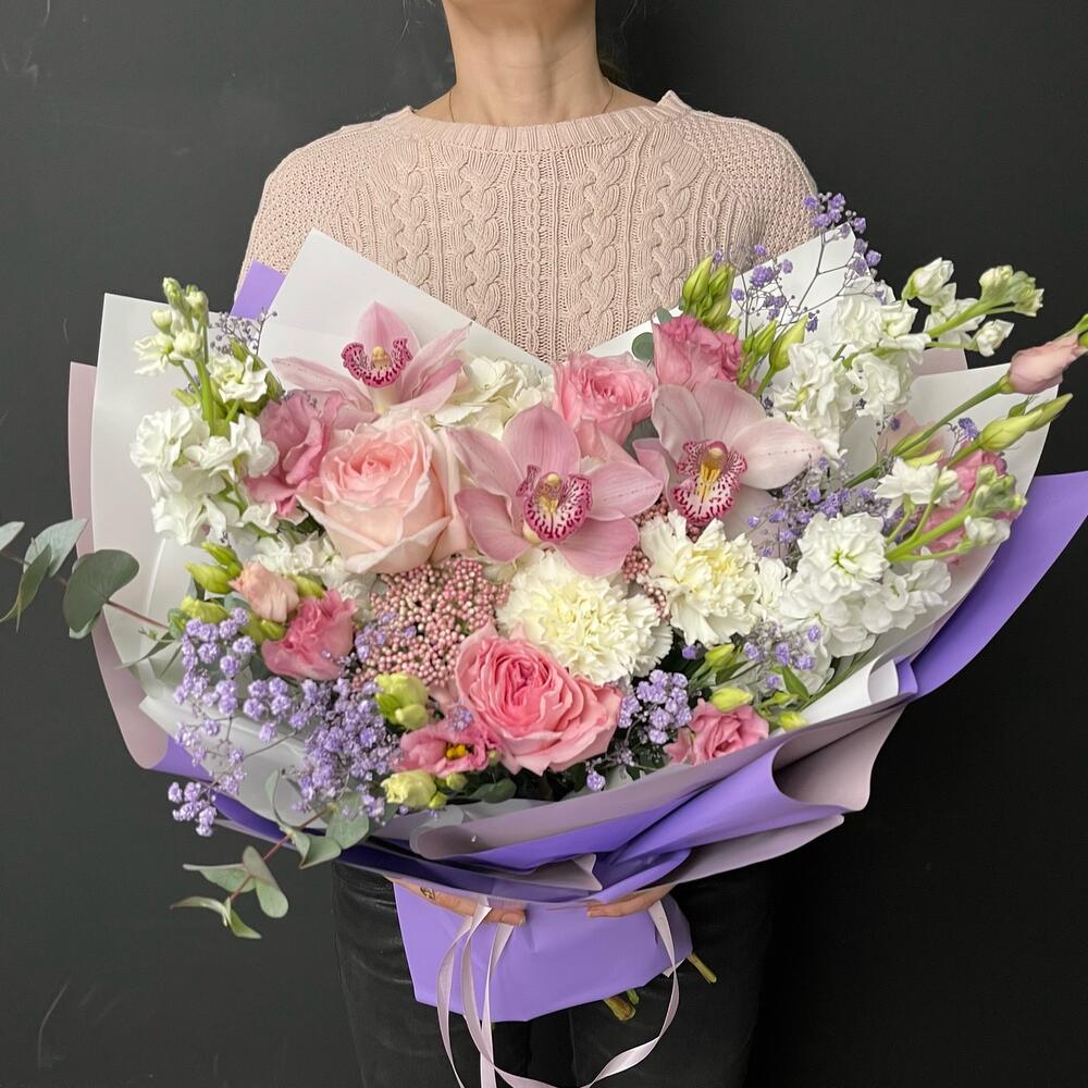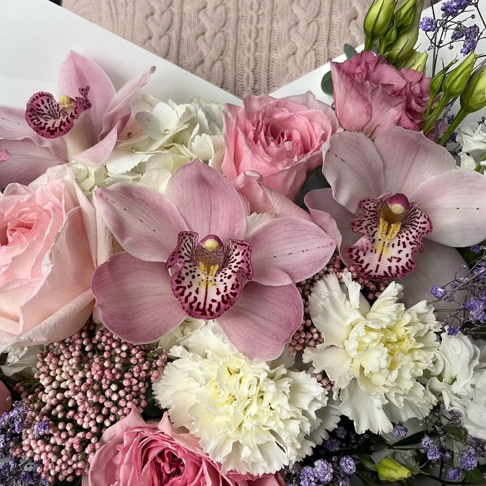 Гипсофила – 2 шт.Гортензия – 1 шт.Лизиантус – 2 шт.Маттиола – 3 шт.Озотамнус – 1 шт.Эвкалипт – 3 шт.Роза – 3 шт.Диантус – 2 шт.Фисташка – 5 шт.ЦИМБИДИУМ – 3 шт.Упаковка дизайнерская – 4 шт.
