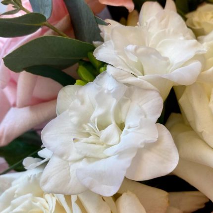 Роза кустовая джульетта – 1 шт.Маттиола белая – 2 шт.Лизиантус Алиса белый – 2 шт.Эвкалипт – 1 шт.Диантус – 3 шт.