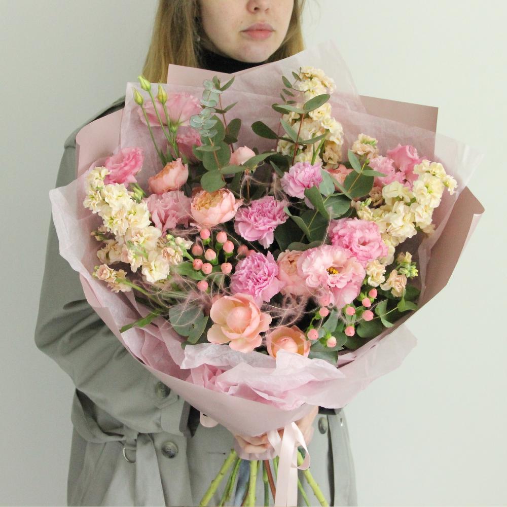 Роза пионовидная кустовая – 2 шт.Маттиола – 3 шт.Лизиантус – 4 шт.Гвоздика – 4 шт.Хиперикум – 2 шт.Ковыль – 2 шт.Эвкалипт – 7 шт.Тишью – 2 шт.Крафт – 2 шт.Лента атласная – 1 шт.