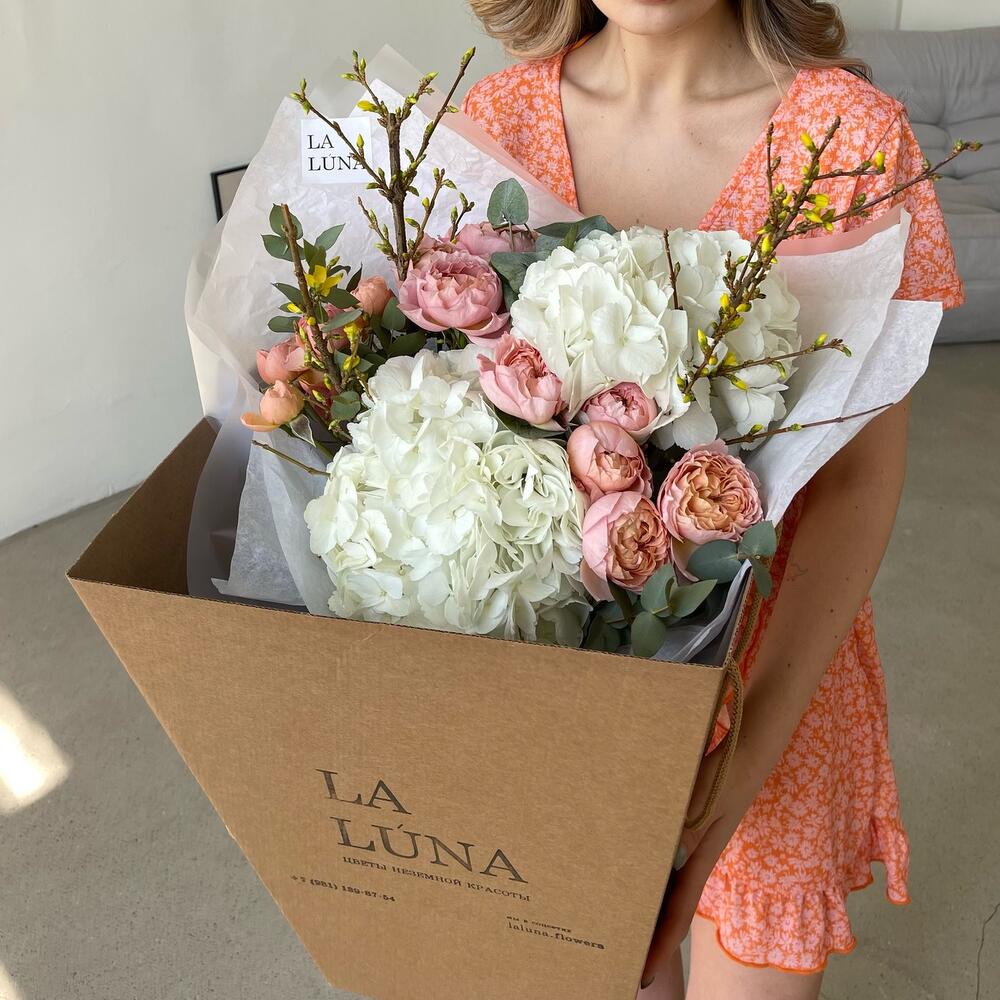 Букет из сезонных гортензий, пионовидных роз и цветущих веток форзиции