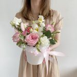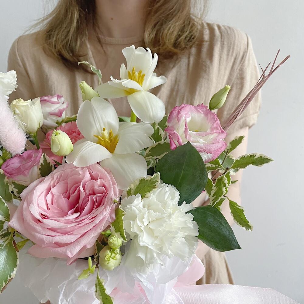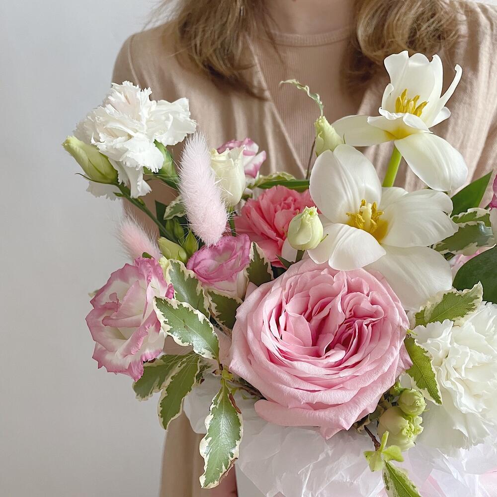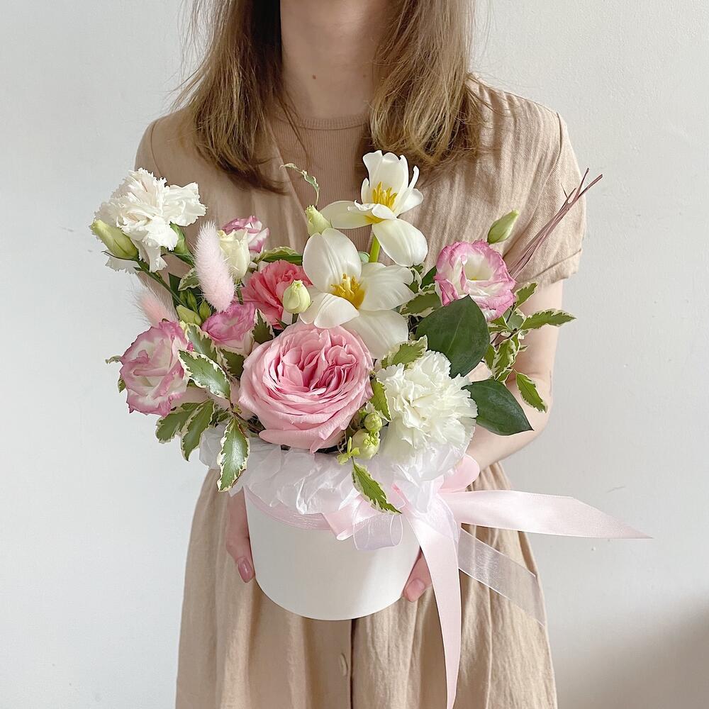 Роза пионовидная – 1 шт.Диантус – 3 шт.Тюльпан – 2 шт.Лизиантус – 1 шт.Питтоспорум – 1 шт.Лагурус – 2 шт.Коробка шляпная – 1 шт.Губка флористическая – 1 шт.