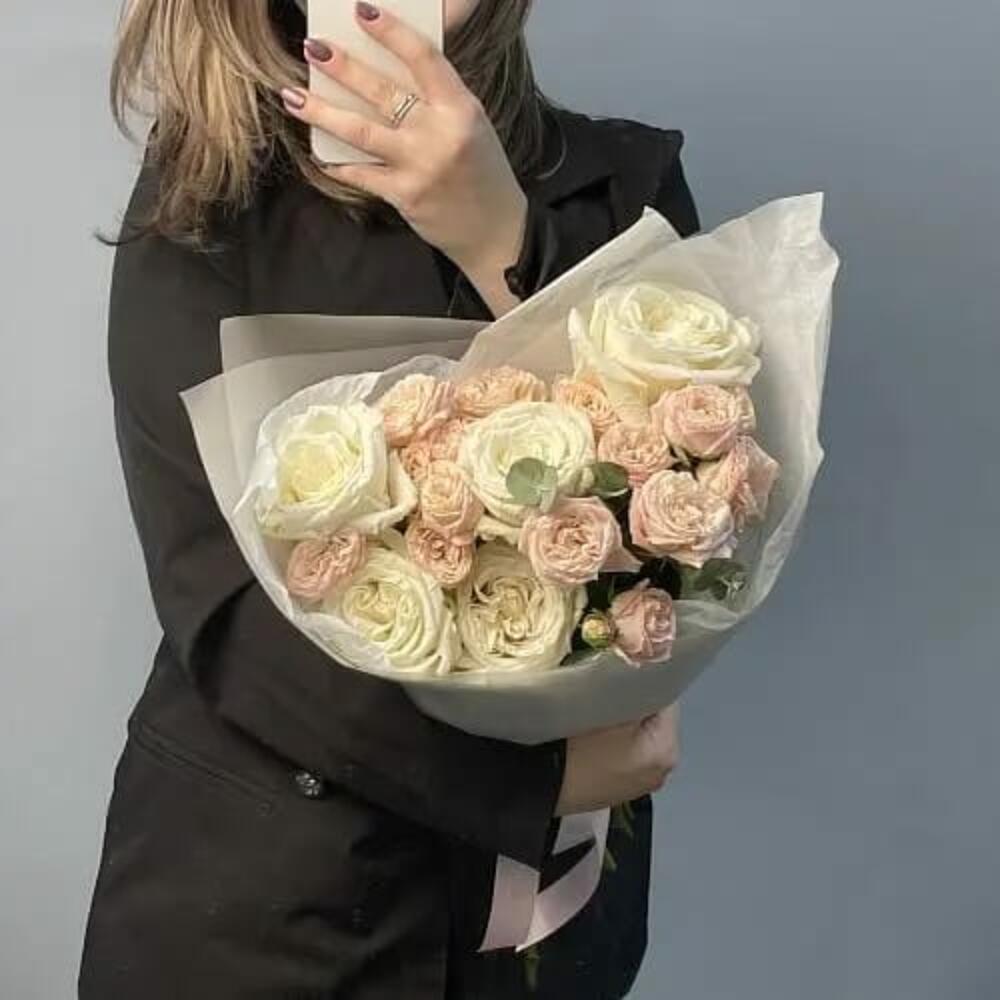 Роза – 5 шт.Дизайнерская упаковка – 2 шт.Кустовая пионовидная роза – 7 шт.Эвкалипт – 5 шт.