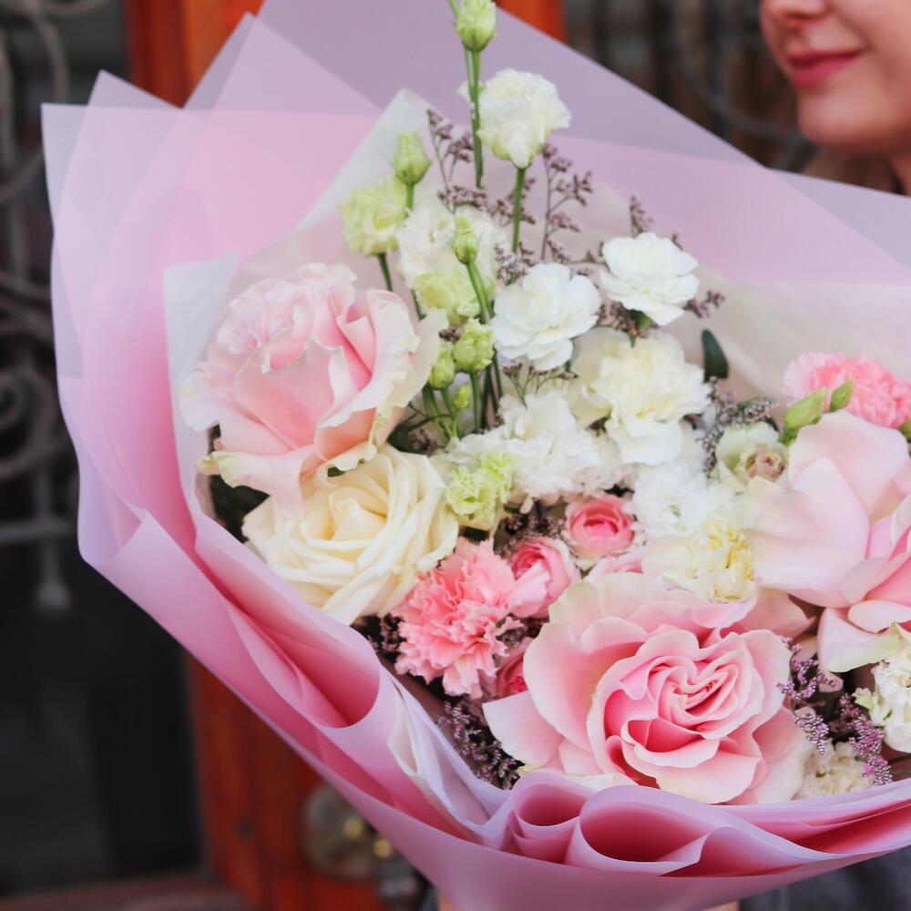 Лизиантус – 2 шт.Лимониум – 1 шт.Кустовая роза – 1 шт.Сантини – 1 шт.Пионовидная роза – 1 шт.Гвоздика сортовая – 5 шт.Французская роза – 3 шт.Открыточка с вашими пожеланиями – 1 шт.Шоколадка – 1 шт.Дизайнерская упаковка – 1 шт.