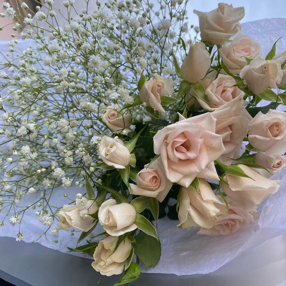 Роза кустовая – 5 шт.гипсофила белая – 6 шт.Тишью – 1 шт.Упаковка дизайнерская – 2 шт.Лента атласная – 1 шт.