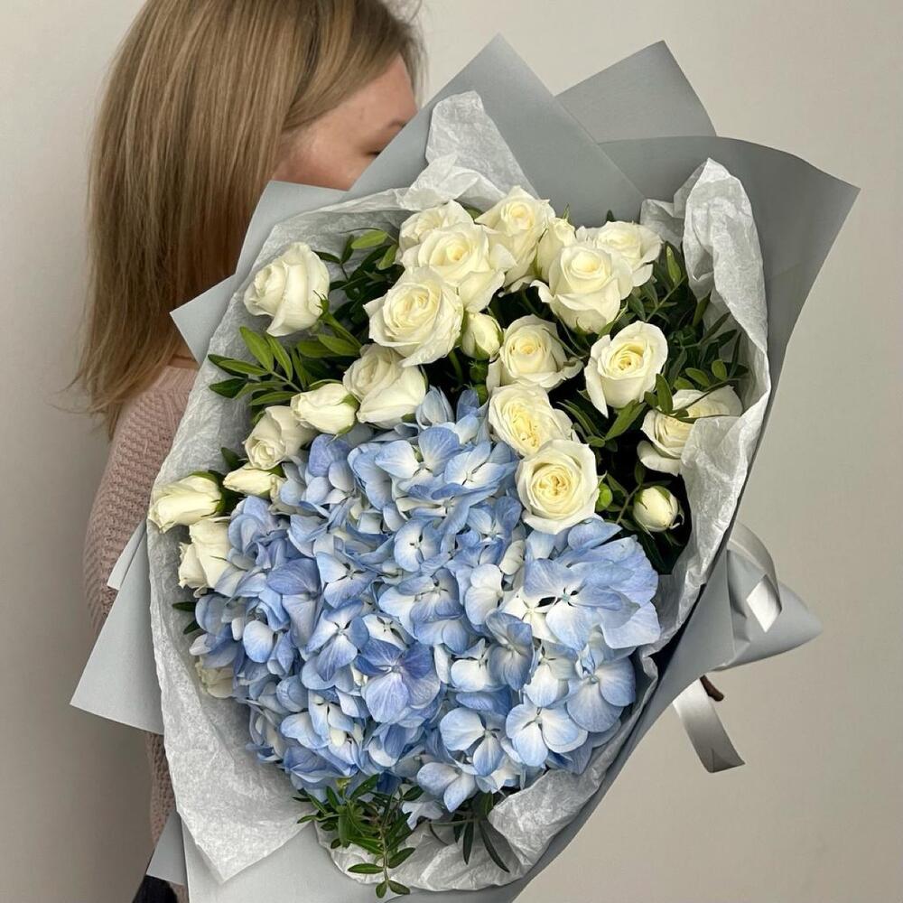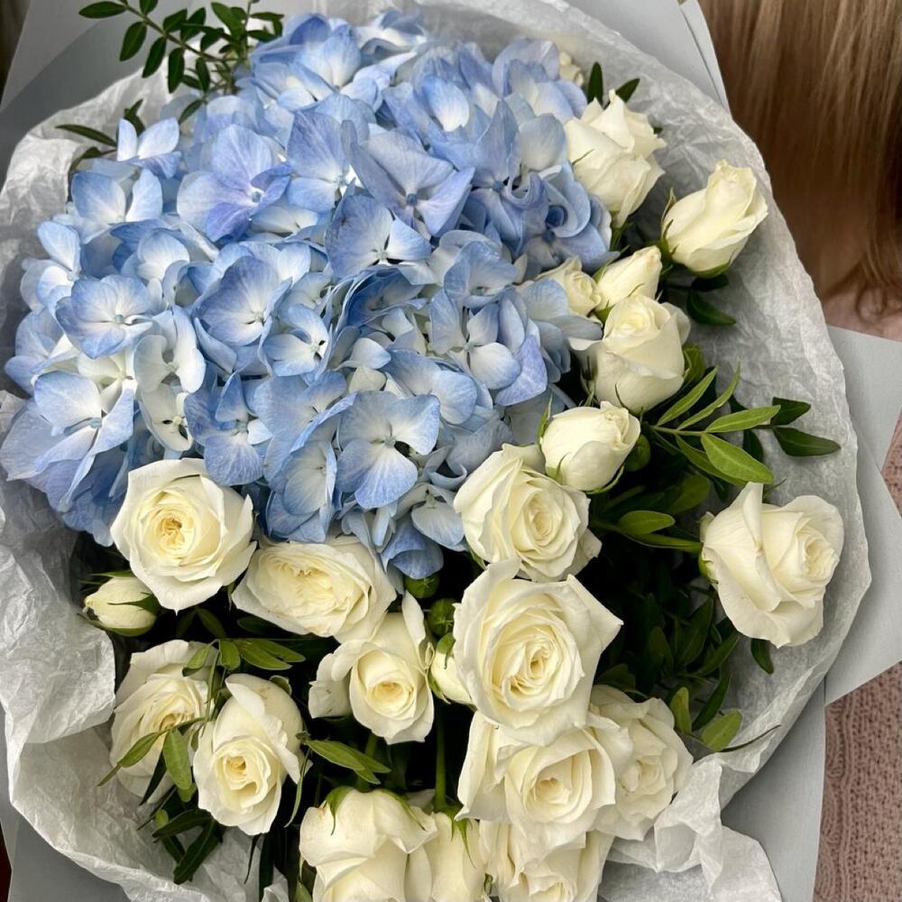 Гортензия – 1 шт.Роза кустовая – 5 шт.Фисташка – 4 шт.Упаковка дизайнерская – 4 шт.