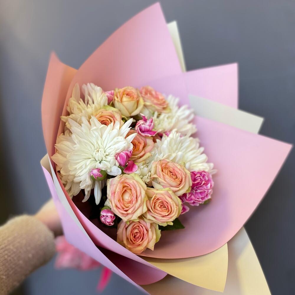 Хризантема кустовая – 2 шт.Кустовая роза – 2 шт.Гвоздика кустовая – 4 шт.Упаковка дизайнерская – 1 шт.Лента атласная – 1 шт.