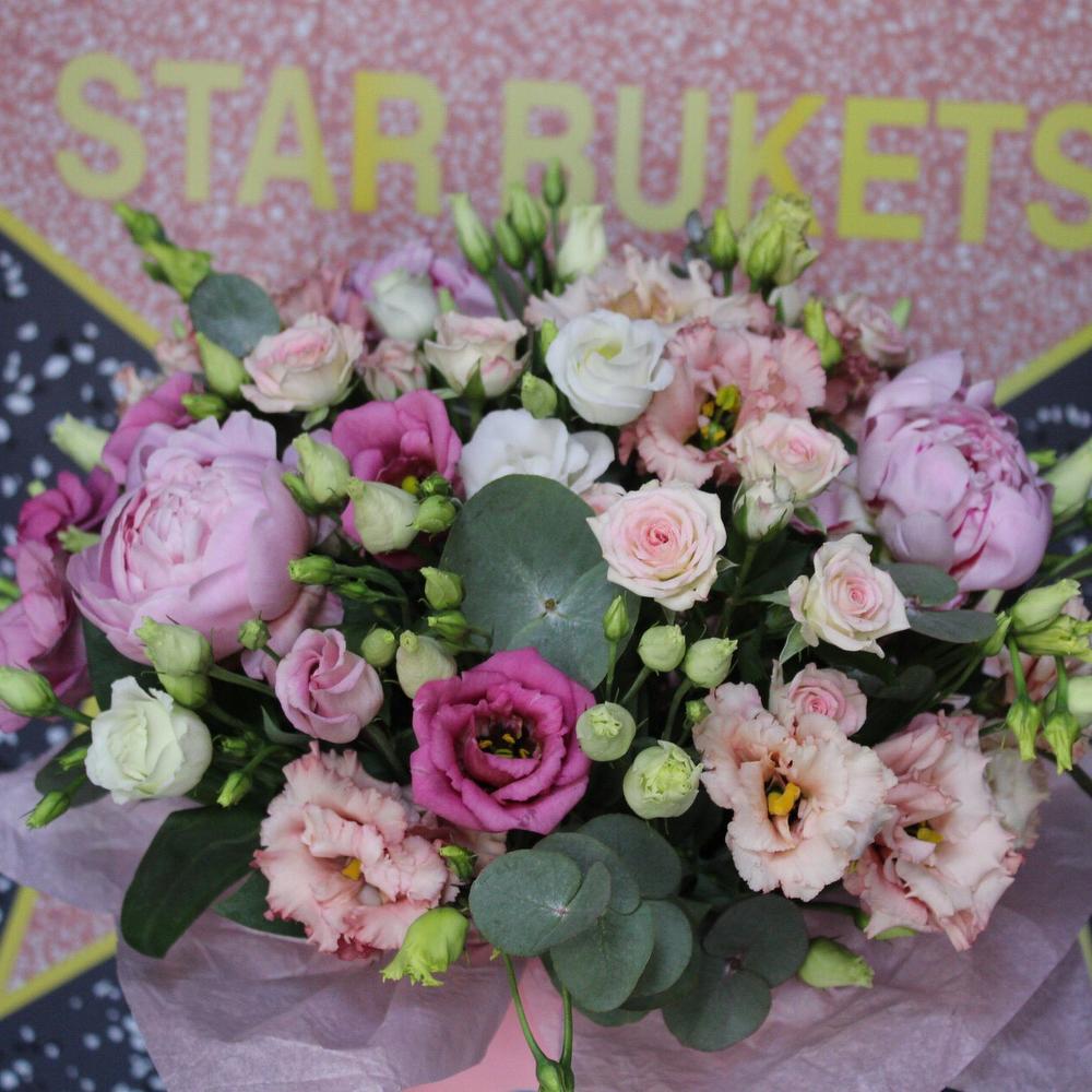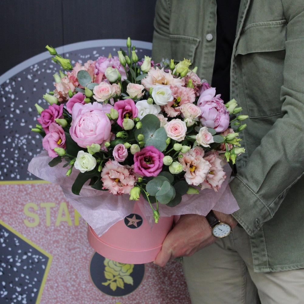 Пион Сара Бернар – 3 шт.Эустома – 7 шт.Эвкалипт – 3 шт.Тишью – 1 шт.Оазис флористический – 1 шт.Коробка шляпная – 1 шт.Роза кустовая – 3 шт.