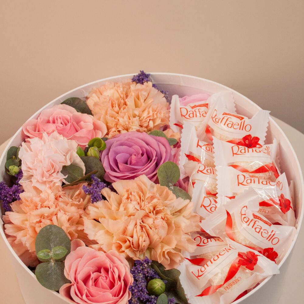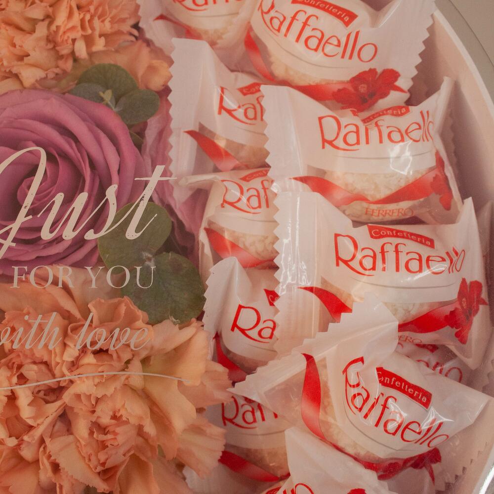 конфеты raffoello – 11 шт. Роза – 3 шт. Гвоздика – 4 шт. Зелень – 1 шт. Лимониум – 1 шт. Эвкалипт – 1 шт. Коробка – 1 шт. Оазис – 1 шт.